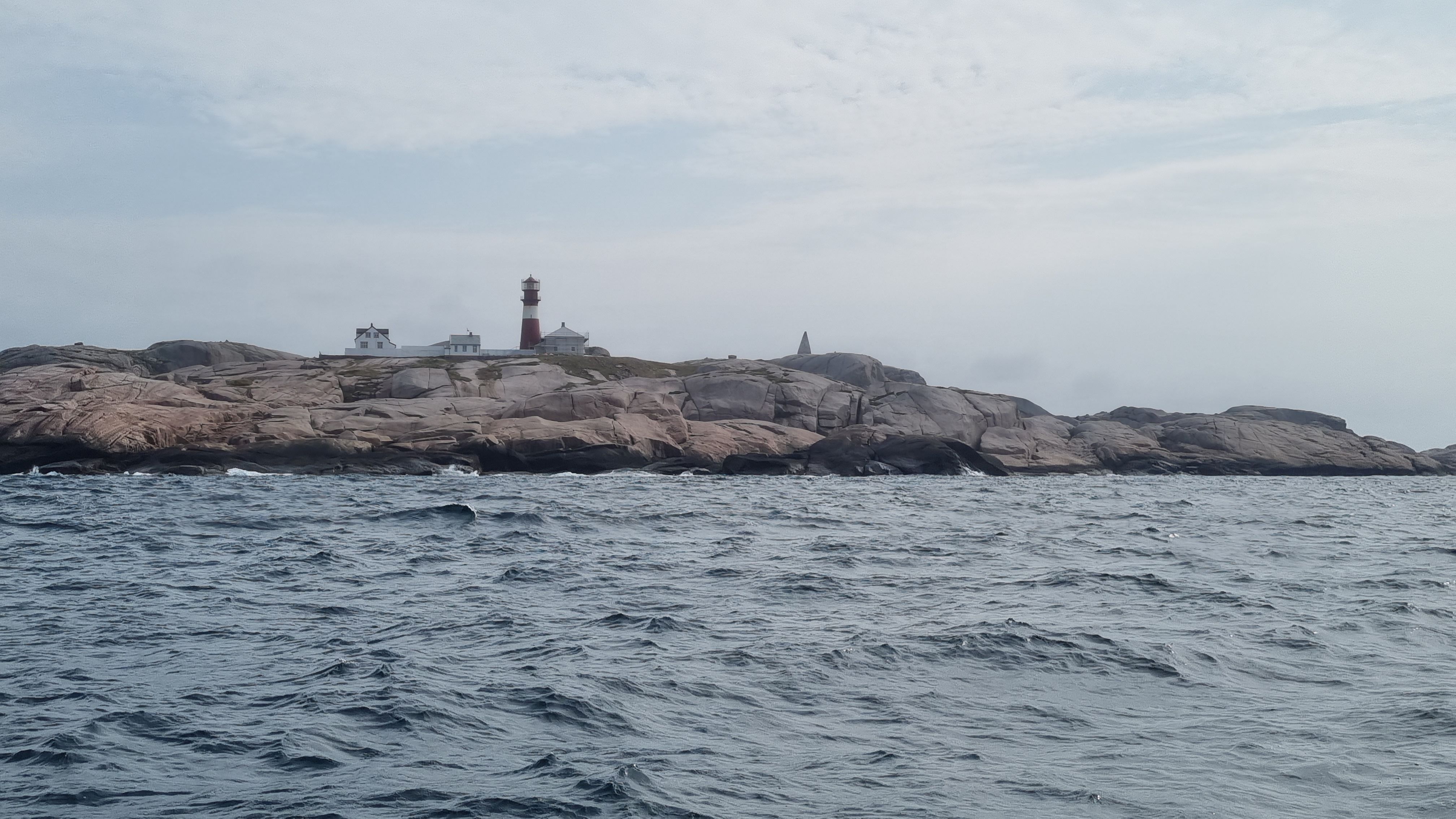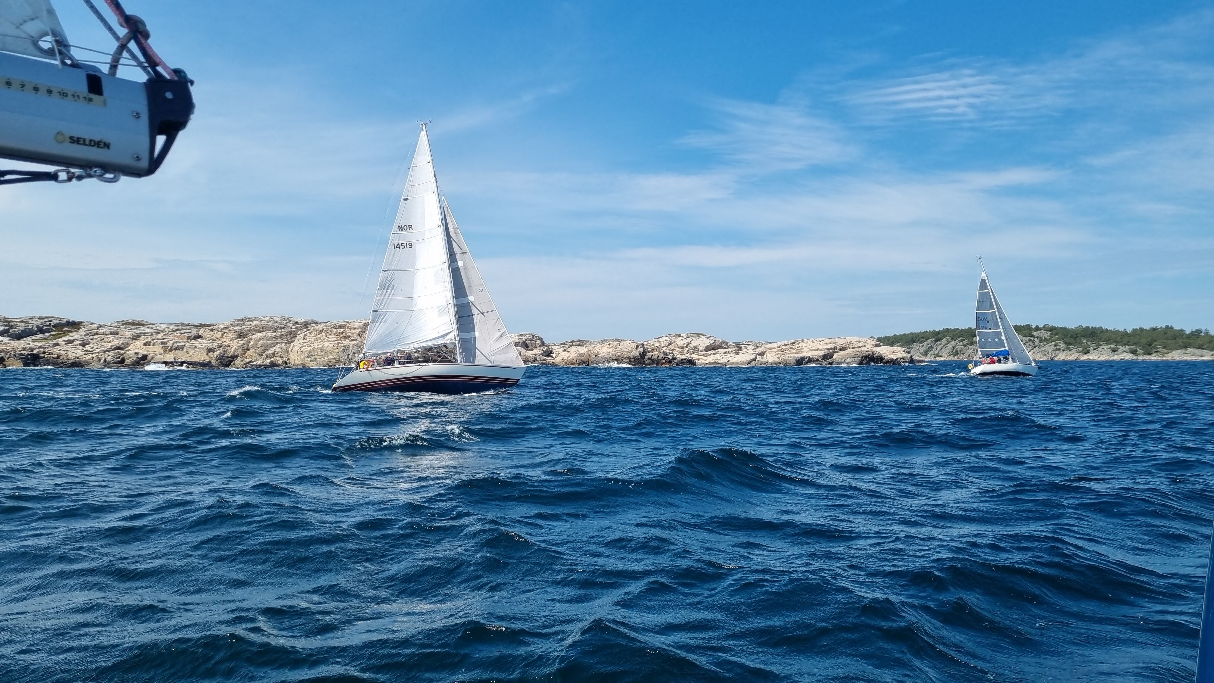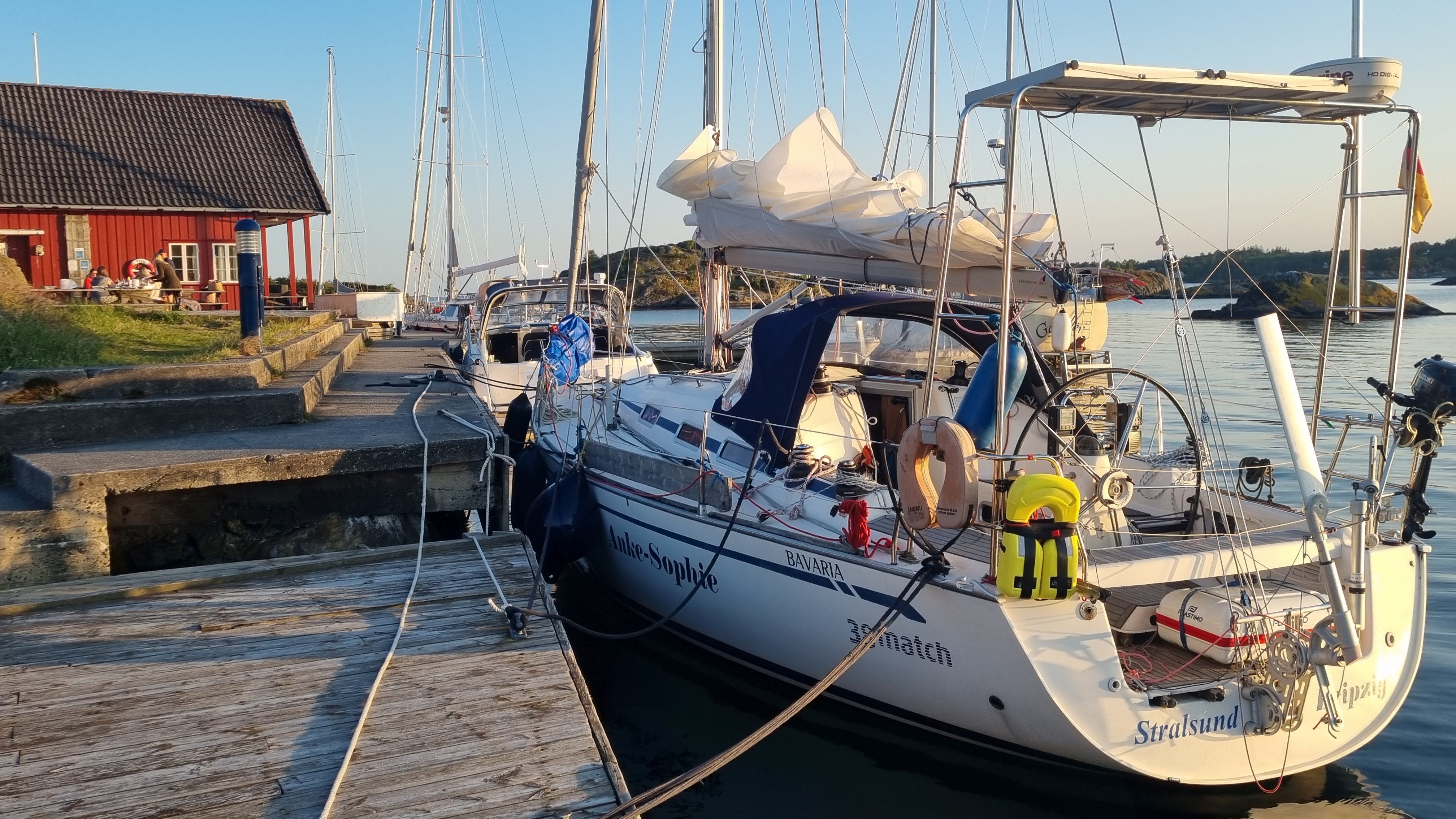 Da der Südostwind weiter stabil bleibt, entschließen wir uns gleich am frühen Morgen die Überfahrt nach Norwegen zu machen, wann hat man schon im Skagerrak solch ruhige Verhältnisse, die wollen wir nutzen. Wir legen um 5:50 Uhr ab, segeln hoch am Wind entlang der Küste und dem Flachgebiet bis zum Punkt, wo sich die beiden Meere treffen. An der Nordtonne setzen wir den Spi und passieren das Verkehrstrennungsgebiet ohne viel Verkehr. Leider schwächt sich der Wind zwischen 11 und 14 Uhr sehr ab, sodass wir unter 4 Knoten laufen. Dann kommt der Wind aber wieder und wir gleiten mit 6-7 kn über das ruhige Skagerrak. In den Abendstunden erschallt der Ruf „Land in Sicht“, aber es braucht noch eine Weile, denn der Wind flaut wieder ab und dafür haben wir eine unangenehme Welle, sodass die Segel schlagen. Die letzte Stunde fahren wir unter Maschine in den Fjord, der zur Stadt Arendal führt, und finden in den vorgelagerten Schären einen tollen Anleger auf Søndre Brattholmen, der zu einem Segelclub gehört. Wir werden nett empfangen, quatschen über die Weltpolitik und bekommen zwei Begrüßungsbiere spendiert. Zahlen müssen wir nichts, denn der Firmenchef, der mit seinen Mitarbeitenden hier feiert, hat bereits für die ganze Insel bezahlt. Wir kommen um 21:15 nach 15,5 Stunden und 80 sm an, was trotz flauem Wind einen Durchschnitt von 5,1 kn bedeutet, fast alles unter Spi gesegelt.