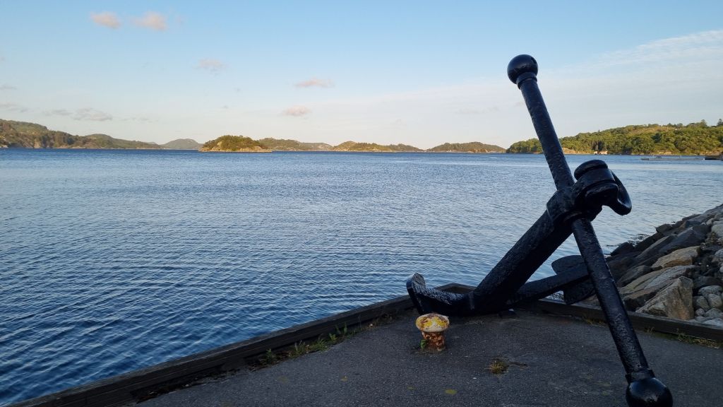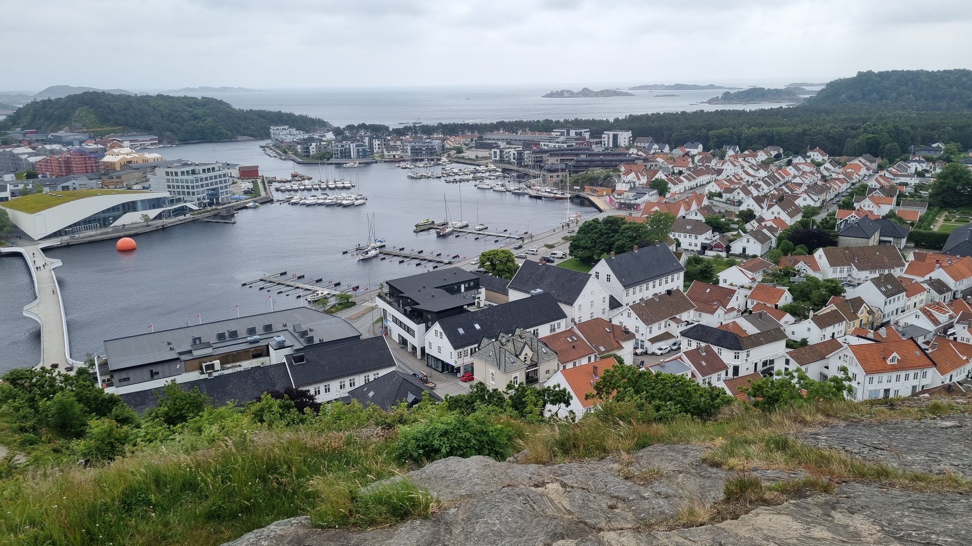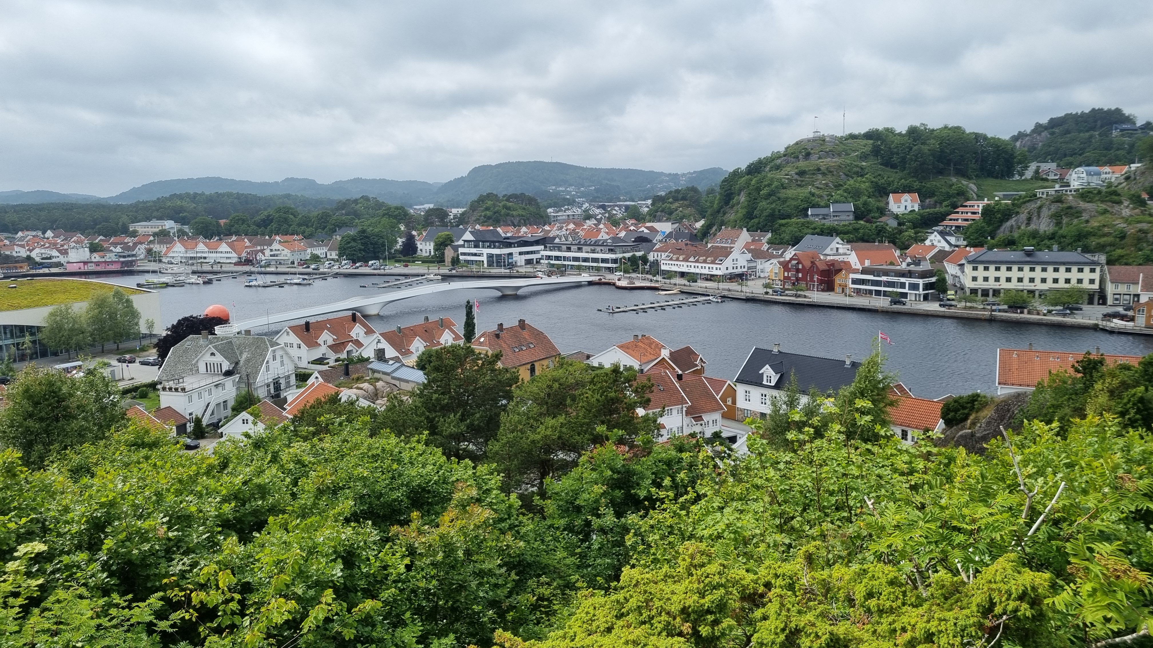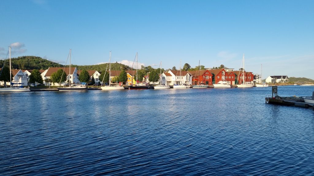 Dann erblicken wir auf PredictWind ein kurzes Zeitfenster nach der dritten Nacht – das Rucken an den Festmachern hat genervt – von am Dienstagmorgen von 4 bis 11 Uhr am Morgen, das wir nutzen wollen, um hier weg und weiter nach Westen zu kommen. Der Wecker wird auf 3 Uhr gestellt, im Hafen ist es nun windstill, im ersten Büchsenlicht fahren wir los und können hoch am Wind aus der Bucht fahren. Draußen empfängt uns eine unangenehme See und bei mäßigem Wind ist es anfangs schwierig, ohne Schlagen der Segel zu segeln, aber dann wird die See ruhiger und der Wind nimmt zu und wir entscheiden uns bei der ruhigen See außerhalb der Schären gegen den Westwind aufzukreuzen bis Mandal. Der Hafen war uns von Dänen empfohlen worden und nach einem Mittagsschläfchen spazieren wir über die Hügel der kleinen Stadt an der Marna.