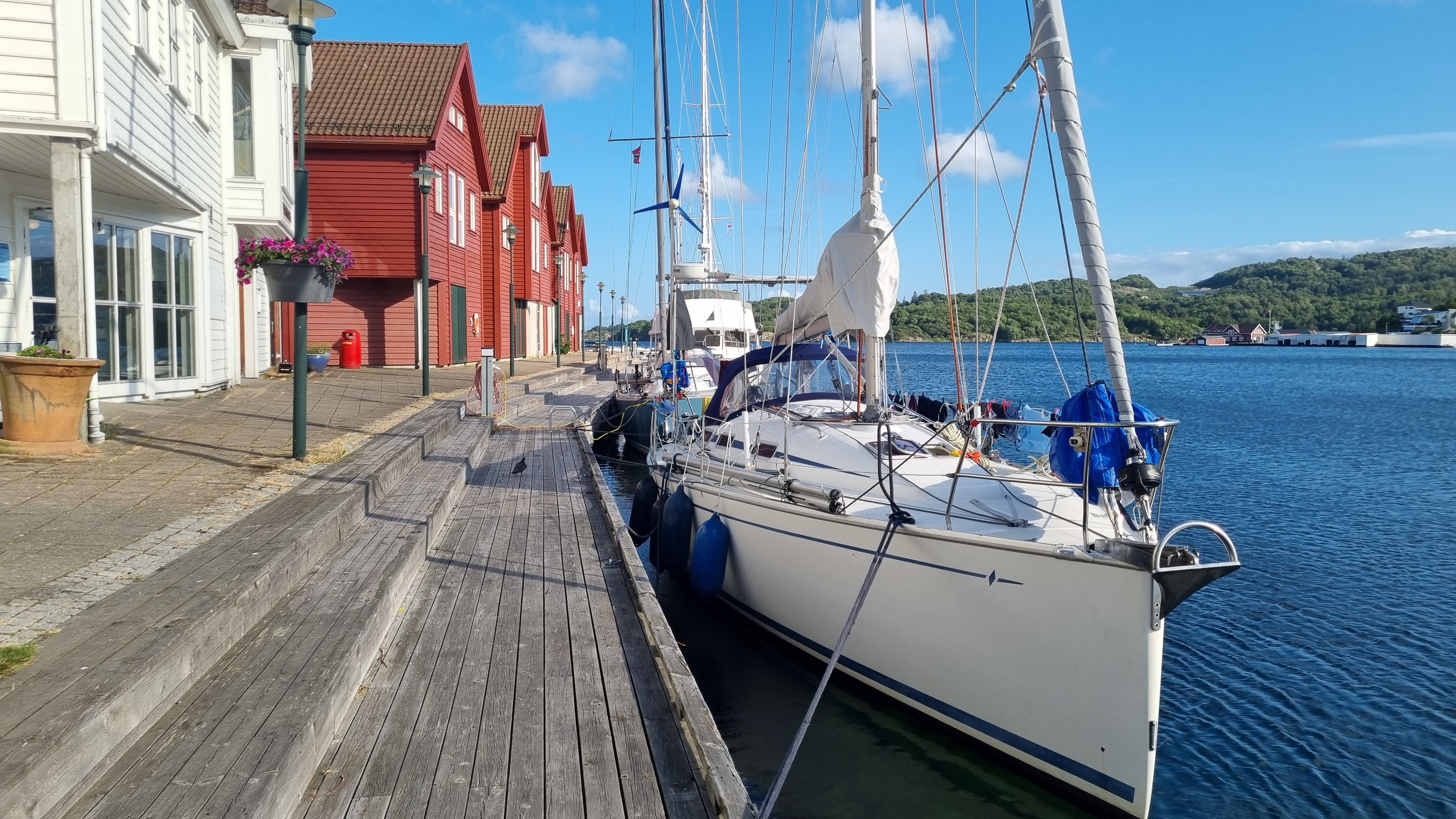 Da wir am nächsten Morgen nach wie vor Wind aus NE haben, setzen wir uns Kristiansand als nächstes Ziel. Die Fahrt beginnt mit einer wunderschönen Passage durch die Schären, die aber gut durch Stangen markiert sind. Auf halber Strecke frischt der Wind wie erwartet immer mehr auf, sodass wir zwischen den vielen Inseln ein wenig in Bedrängnis kommen, da wir einzelne Strecken direkt vor dem Wind segeln müssen und uns Halsen drohen. Auch kommt uns eine Regatta aus ca. 50 Yachten entgegen, die zwischen den Schären ihrem Ziel entgegen kreuzen. Bei Winden >20 kn wollen wir in dem teilweise engen Fahrwasser mit Gegenverkehr schwierige Situationen vermeiden und wechseln das ungereffte Groß gegen eine halb eingerollte Genua. Als wir in der Marina von Kristiansand ankommen, bläst es richtig, der Hafen ist sehr eng und unübersichtlich und wegen eines Festivals überlaufen und so übersehe ich leider einen unter Wasser verspannten Festmacher eines Motorbootes. So sind wir gefangen in einer unangenehmen Lage, aus der wir uns aber mit Hilfe einiger Landleinen und der Unterstützung anderer Segler befreien können. Aber danach sind wir kaputt und es reicht uns erst einmal. Der nächste Tag verspricht Flaute und der darauf Starkwind aus Westen, so ist eine zweitägige Pause angesagt. Die Marina gefällt uns nicht, durch das Festival gibt es zu viele betrunkene Partysüchtige, sie ist zu teuer und vollkommen digitalisiert. Neben dem Liegeplatz und dem Elektroanschluss müssen wir auch die Dusche über das Internet jeweils einzeln über Barcodes buchen, also nein, jetzt kann man ohne sein Handy nicht mehr duschen! Das ist nicht unsere Welt…