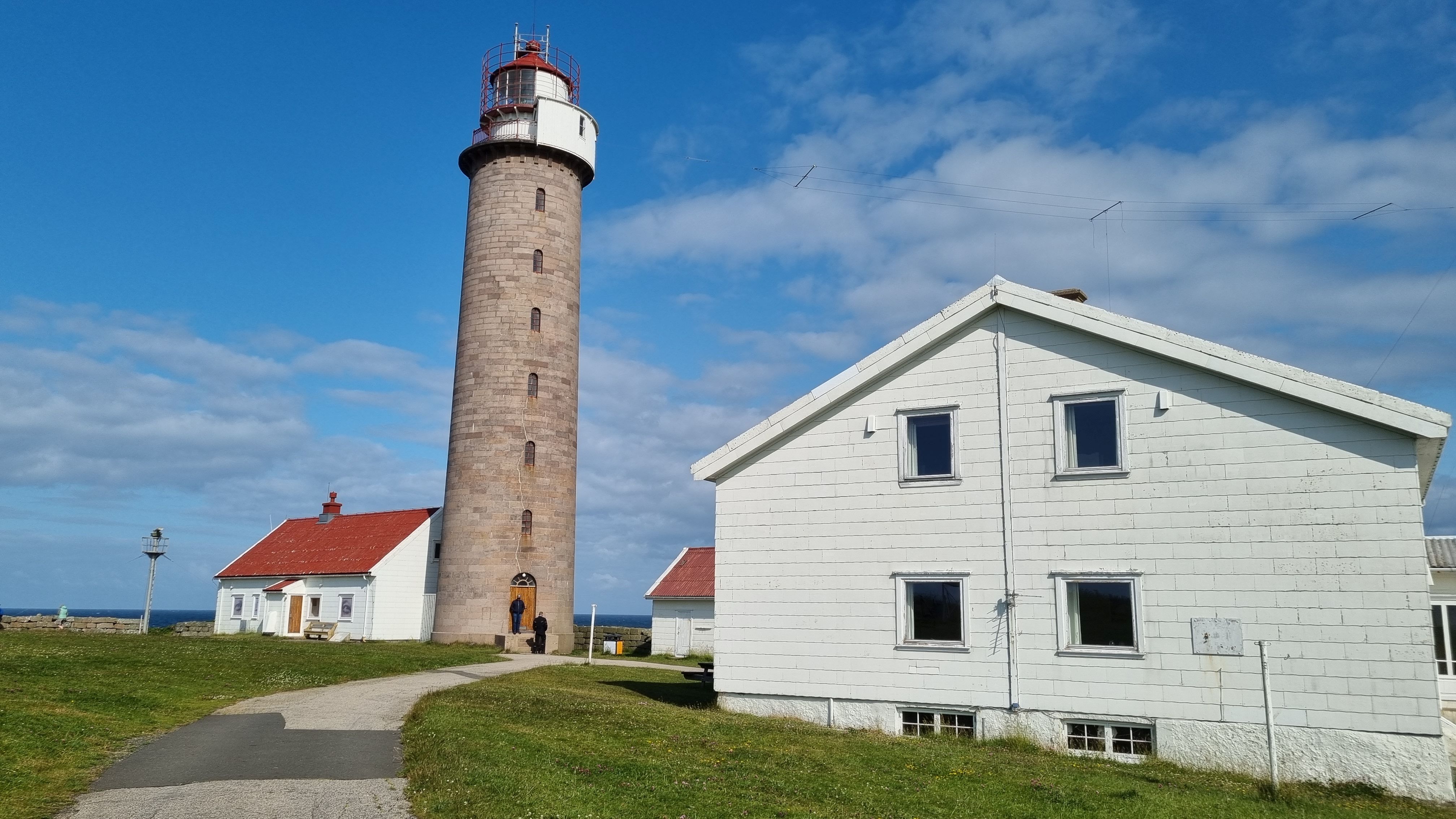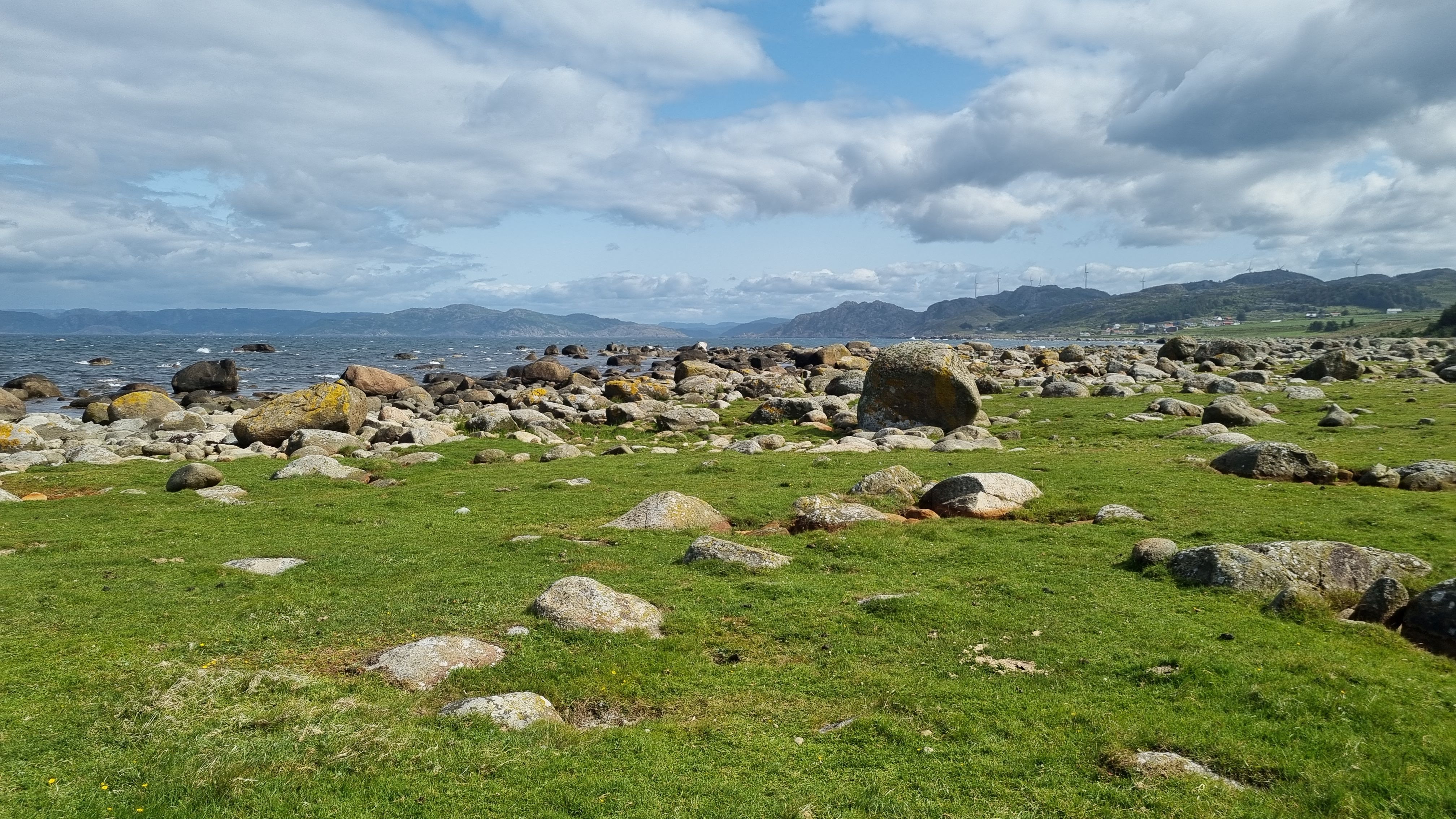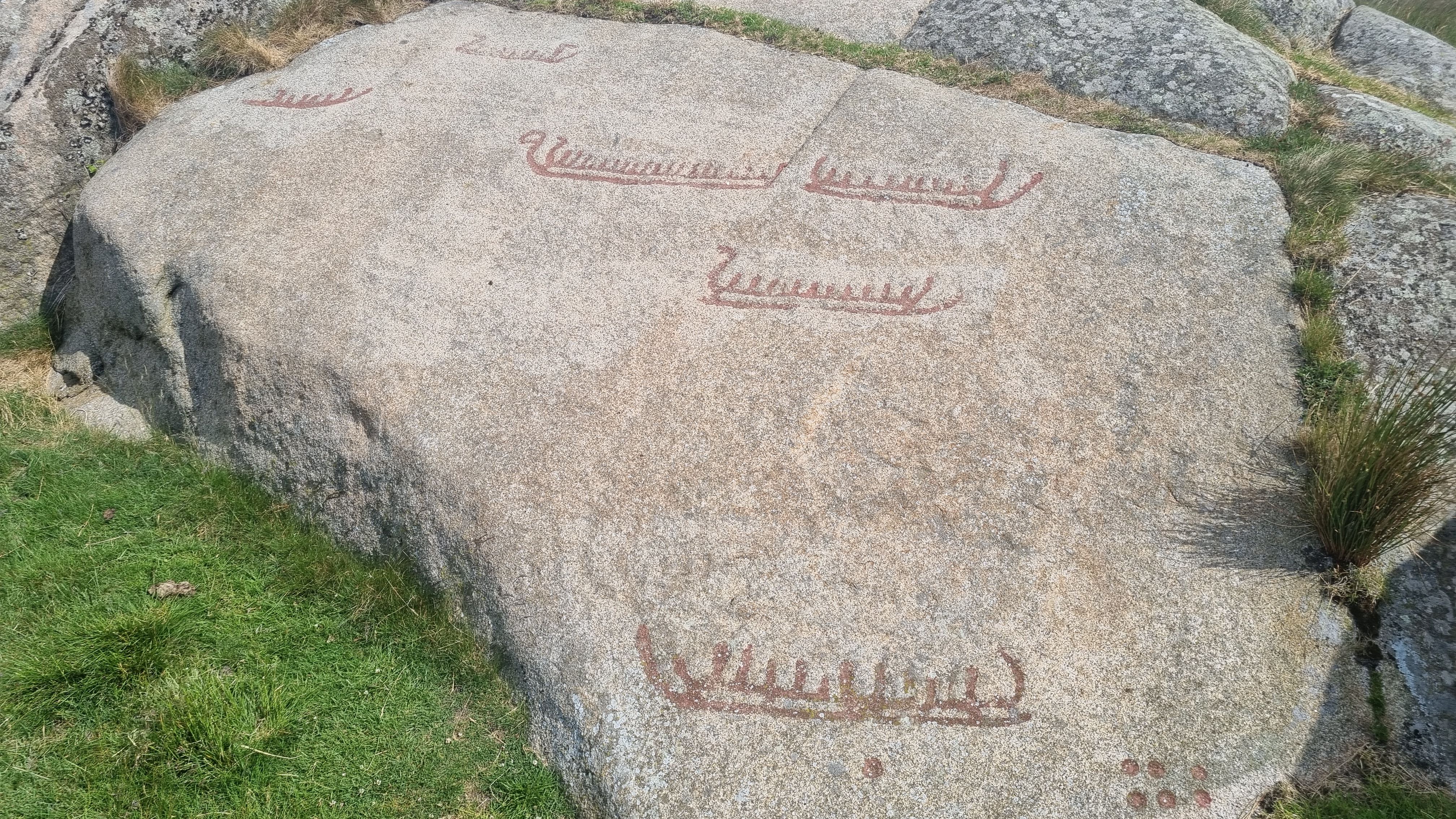 Am nächsten Morgen nutzen wir ein ähnliches Wetterfenster ohne den starken Westwind und starten wieder früh und haben heute bei ruhiger See eine angenehme Fahrt zunächst durch die Schären und dann mit einem langen Schlag auf die offene See und nach einer gut gewählten Wende direkt am Kap Lindesnes vorbei bis in den kleinen Ort Farsund, wo wir in einer angenehmen Marina mit netten Leuten ins Gespräch kommen, unsere Wäsche waschen und Pläne für den nächsten Hafentag schmieden, denn draußen soll es wieder mit 30 kn wehen, und bei 7 Bft fahren wir nicht gegen den Wind an. Es scheint ein Naturgesetz zu sein, dass hier der Wind einem kräftig entgegen weht. Denn so war das auch im September 2022, als Werner, Christian und ich hier nach Süden segeln wollten und nicht gegen 32 kn aus SE ankamen und umdrehen mussten, um im Hafen Borshavn Schutz zu suchen. Dieses Mal wollen wir nach Norden, natürlich kommt der Wind seit Tagen aus NW. Wir haben Zeit und unternehmen wie damals Wanderungen. Wir besichtigen das Lista Fyr. Ihr könnt euch zum Vergleich den Blogbeitrag „Egersund – Kloster “ aus Sept. 2022 ansehen; die Kunstinstallationen wie die goldenen Autos, der Sessel im Rasen und das in den Rasen gemähte „Love“ sind nicht mehr zu sehen. Es ist ein besonderer Moment, wenn man bei Reisen an bekannte Orte wiederkehrt und die Veränderungen wahrnimmt. Wir wandern von dort zu dem Ort Pennefeltet, wo wir Felszeichnungen besichtigen, die Langboote und andere Symbole aus der Bronzezeit (1800 bis 500 v. Chr.) darstellen.