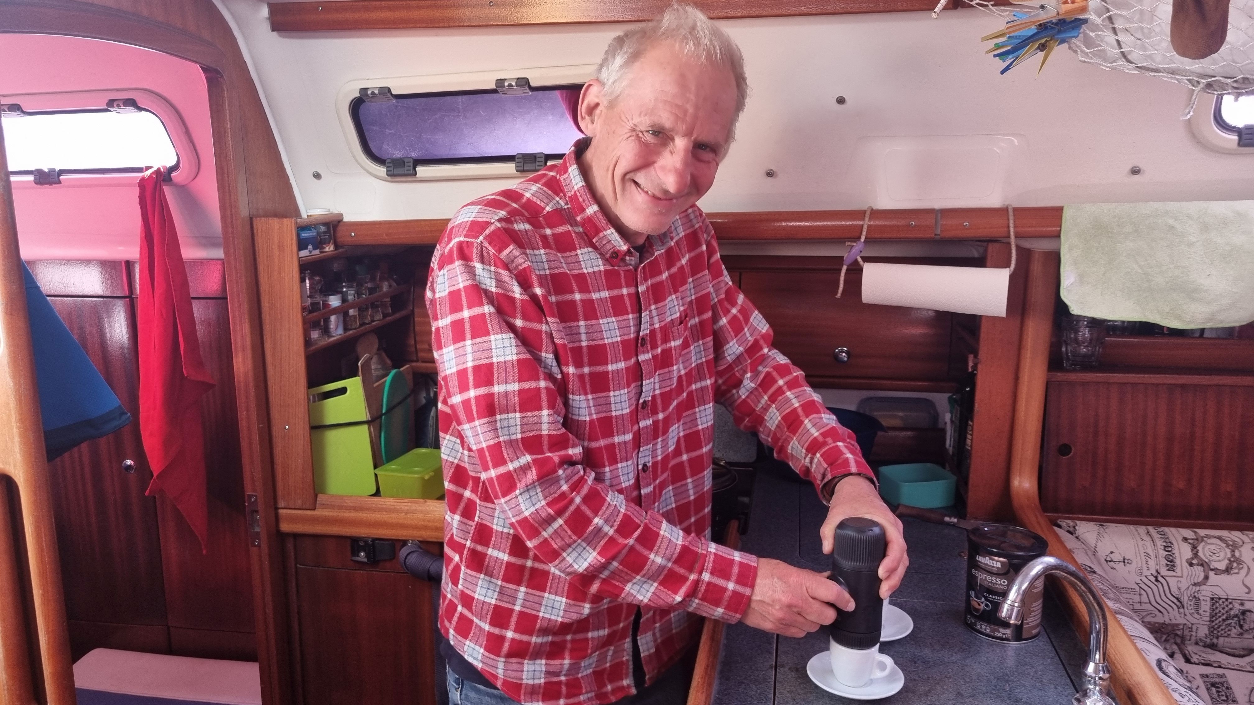Nachdem auf Anholt der Starkwind nachgelassen hat, legen wir früh ab, denn zum einen nimmt ab 11 Uhr der Wind bei Anholt auf 6 Bft. zu und zum anderen droht er ab 16 Uhr rechtdrehend bei Læsø einzuschlafen. Der Tag ist dafür geeignet, dass Annette ihre neue Segeljacke testet, denn es regnet praktisch ununterbrochen bei 13° während in Süddeutschland 30° sind. Wir kommen bei raumem Kurs flott voran, reffen Groß und Genua, als der Wind stärker wird, und wie die Wettermodelle gezeigt haben, erreichen wir Vesterø bei 2-3 Bft rechtzeitig, es bleibt den Abend bei Dauerregen, sodass wir tatsächlich die elektrischen Konvektoren für kurze Zeit anschalten, um es uns unter Deck gemütlich zu machen mit unserer neuen Anschaffung: einem frisch bereiteten Espresso mit unserer neuen handbetriebenen Maschine für den besonderen Genuss, ansonsten gibt es an Bord löslichen Espressokaffee oder Brühkaffee aus der „Drückkanne“.