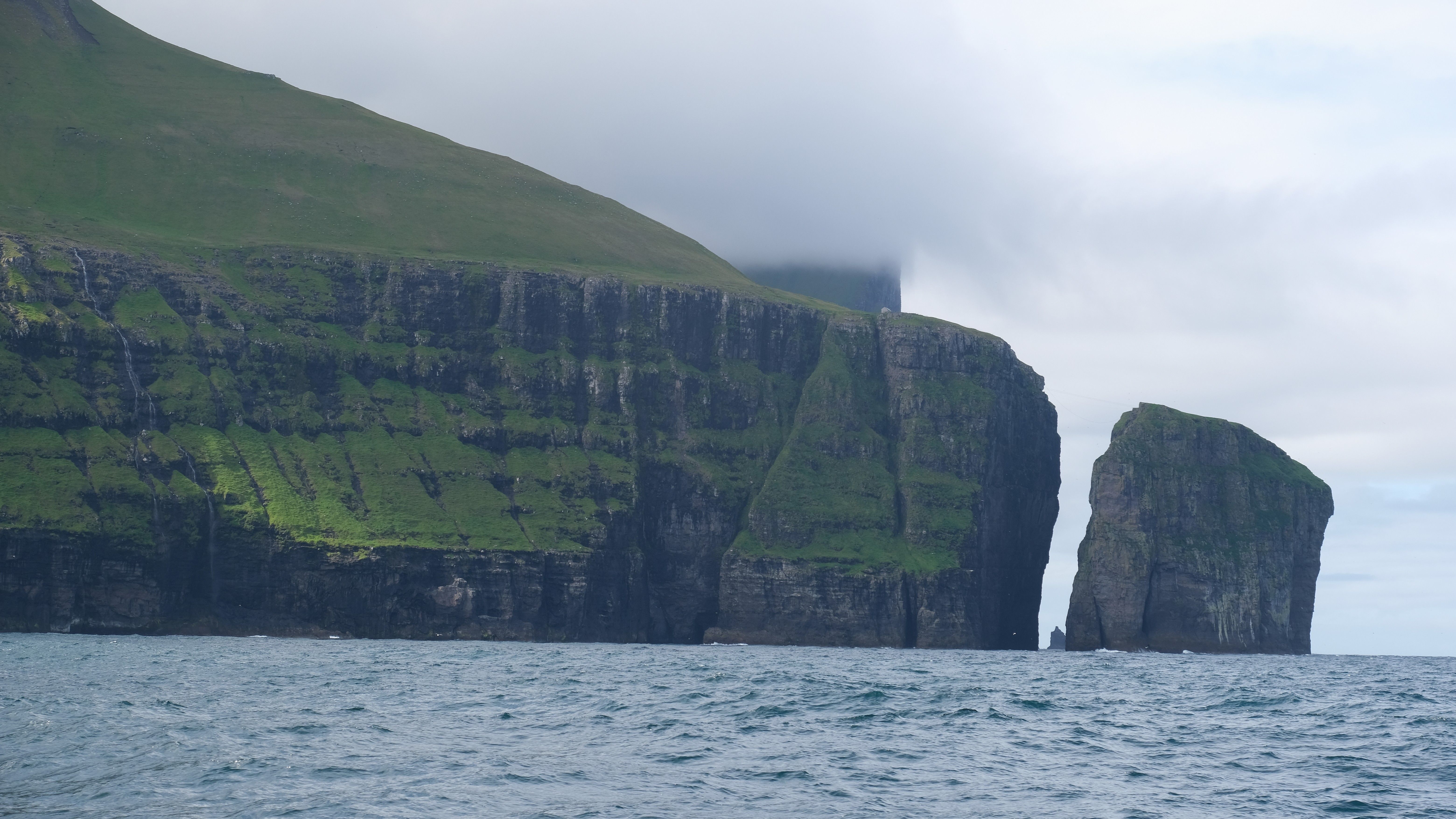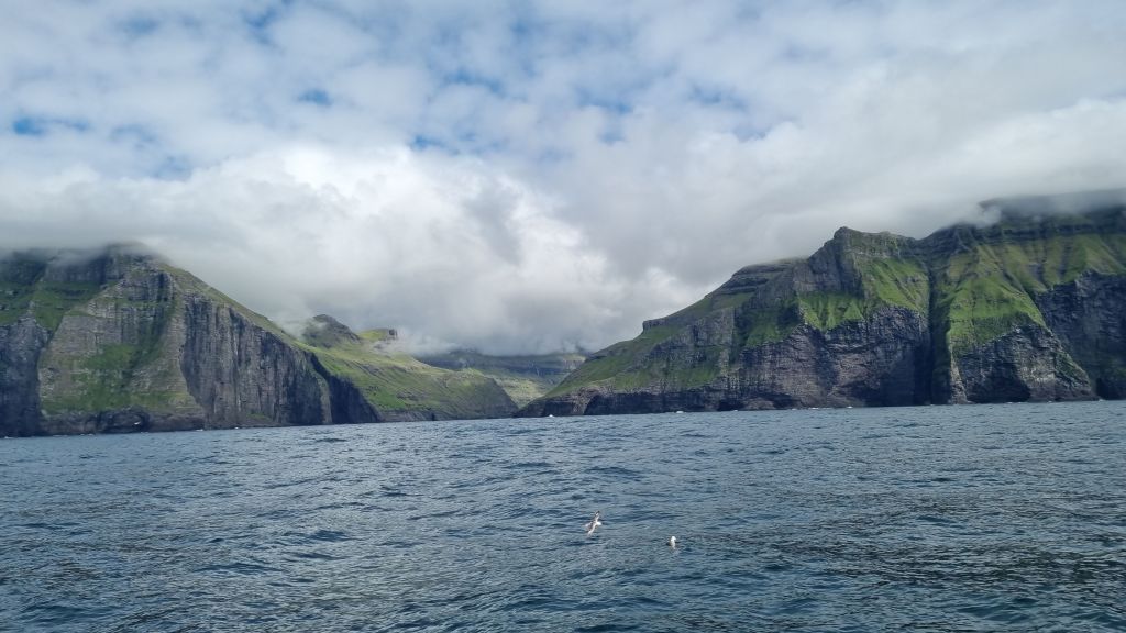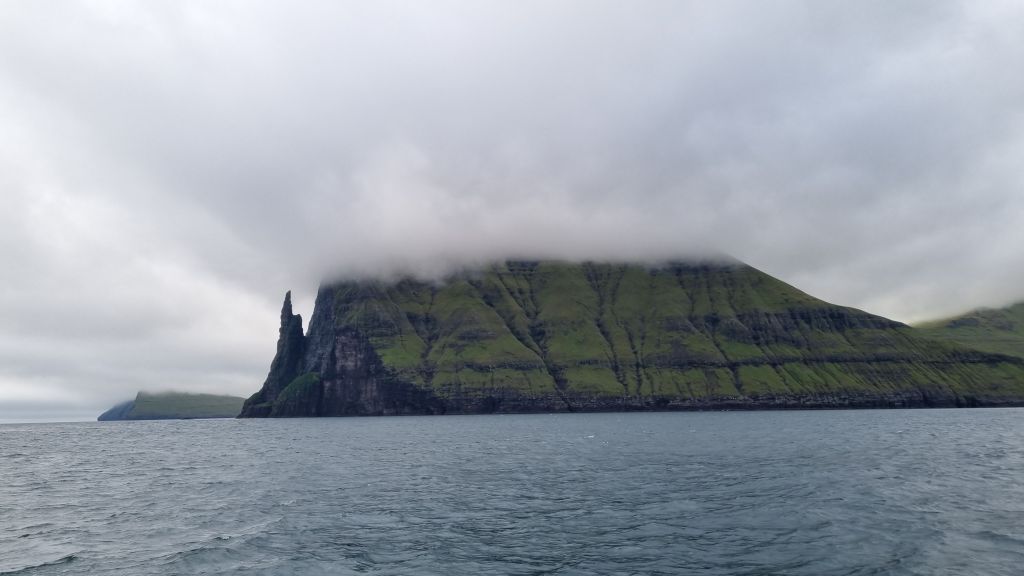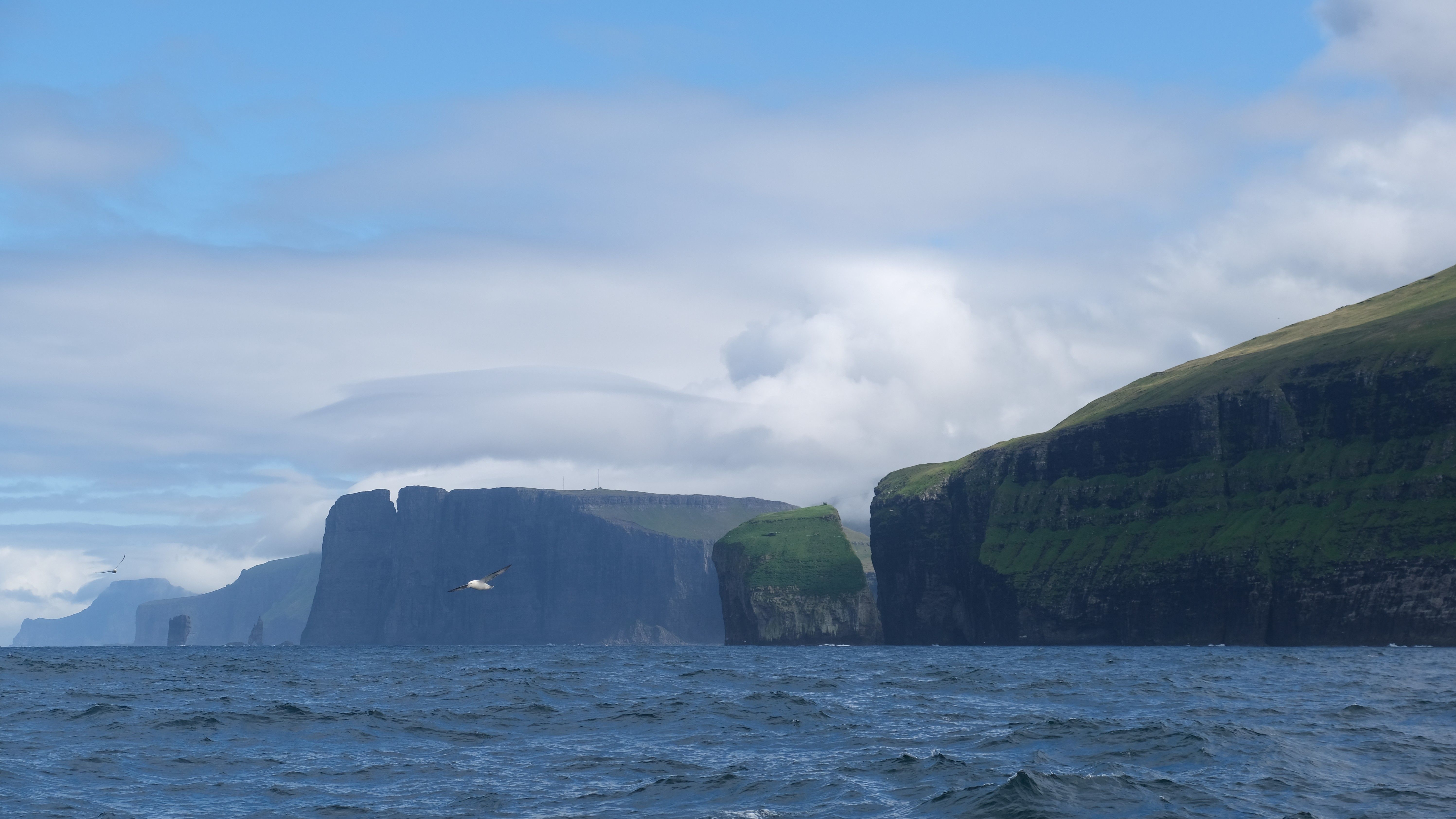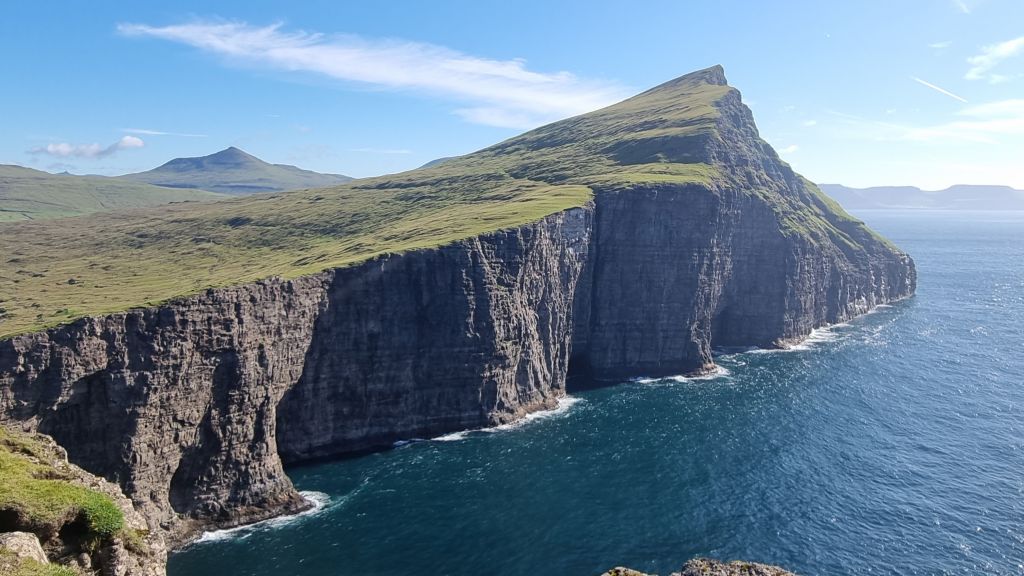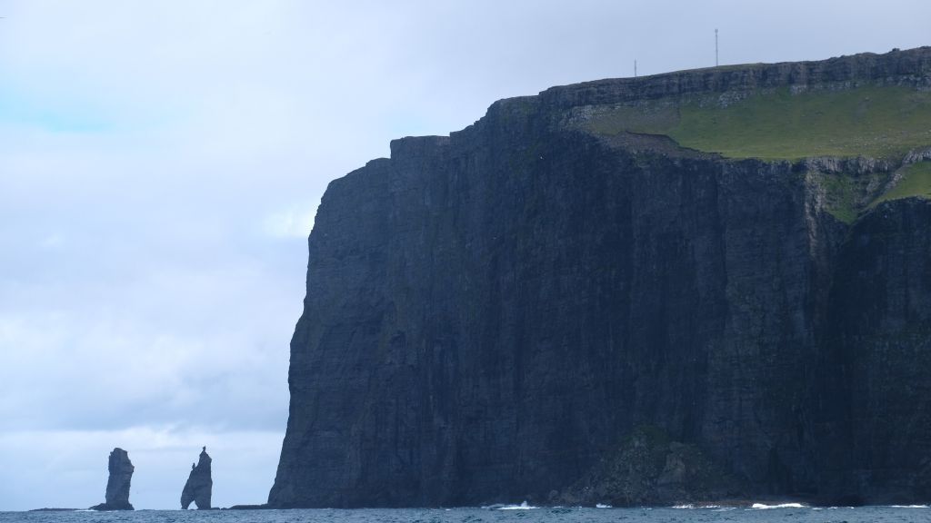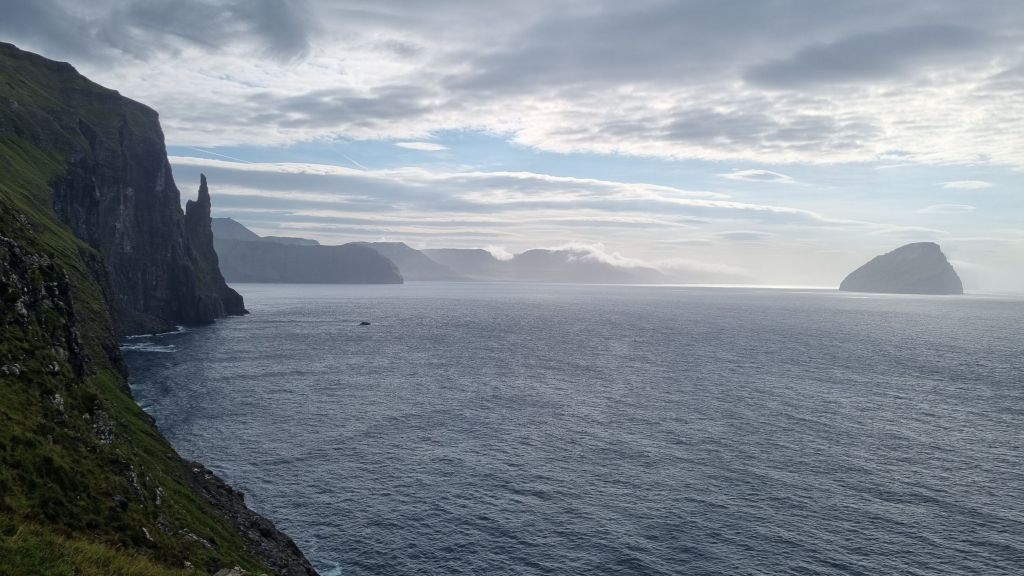 Entsprechend unserem Dreitagesrhythmus wechseln wir nach Miðvágur auf der Insel Vágar, um dort Kathrin zu empfangen, die uns für drei Wochen besucht. Der Flughafen liegt mit dem Bus nur 5 Minuten vom Hafen entfernt, wir holen sie sozusagen mit der Anke-Sophie am Flughafen ab. Am nächsten Tag legen wir dieses Mal erst um 15 Uhr ab, da sich das Hochwasser natürlich inzwischen nach hinten verschoben hat. Die Abfahrt wird so gelegt, dass die Strömung uns mit mehr als 4 Knoten ordentlich den Vágafjørður nach Südostenschiebt. Teilweise können wir schön segeln und wir kreuzen bei  düsterem Wetter in den Fjord von Miðvágur auf, die Wolken kommen fast bis auf Seehöhe herunter. Bei Nieselregen legen wir erst am Pier an und wechseln dann in den Fischereihafen, nachdem mir ein Fischer erklärt hatte, dass sein Nachbarplatz für ein paar Tage frei sein wird. Am nächsten Morgen überrascht uns die Sonne und ein wolkenloser Himmel, welch seltenes Glück! Ideal für die Wanderung zum Traelanípan. Die Wikinger sollen von dieser senkrechten Klippe ihre alten nicht mehr arbeitsfähigen Sklaven in die See gestürzt haben. Wir werden verwöhnt, auch der zweite Tag ist sonnig und führt uns in den Nachbarort Sandavágur, wo uns ein Weg entlang der Klippen zu einer 313 Meter hohen Felsnadel führt, die sich Trøllkonufingur nennt, wieder entsprechend einer Sage der Finger einer Trollfrau. Nach der Wanderung suchen wir das nette Café Fiskastykkið auf. Es ist ein historisches Warenhaus, das an einem Trockenpatz für Klippfisch steht. Annette lädt mich zu Cappuccino und Rhabarbercrumble ein. Es ist das beste Café der Färöer, es gibt leider nicht viele. Übrigens lässt das Wetter hier nur drei Nutzpflanzen auf den Inseln gedeihen: Kartoffeln, Steckrüben und Rhabarber.