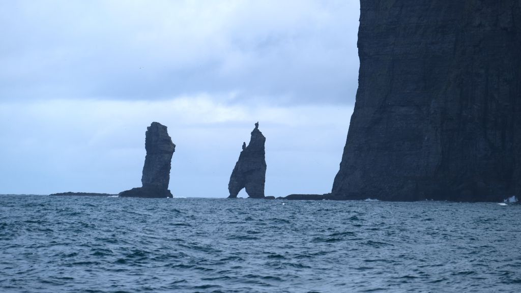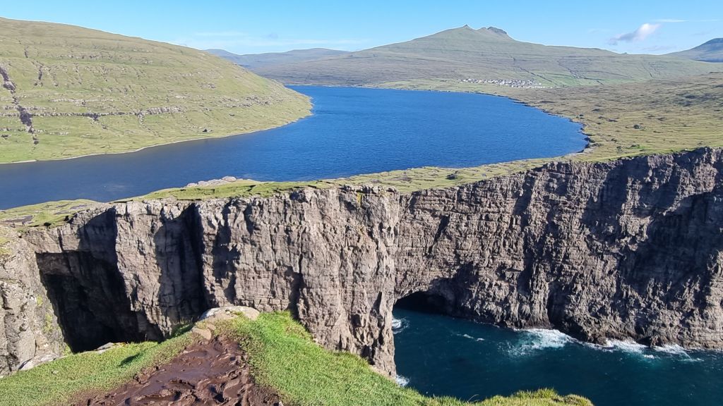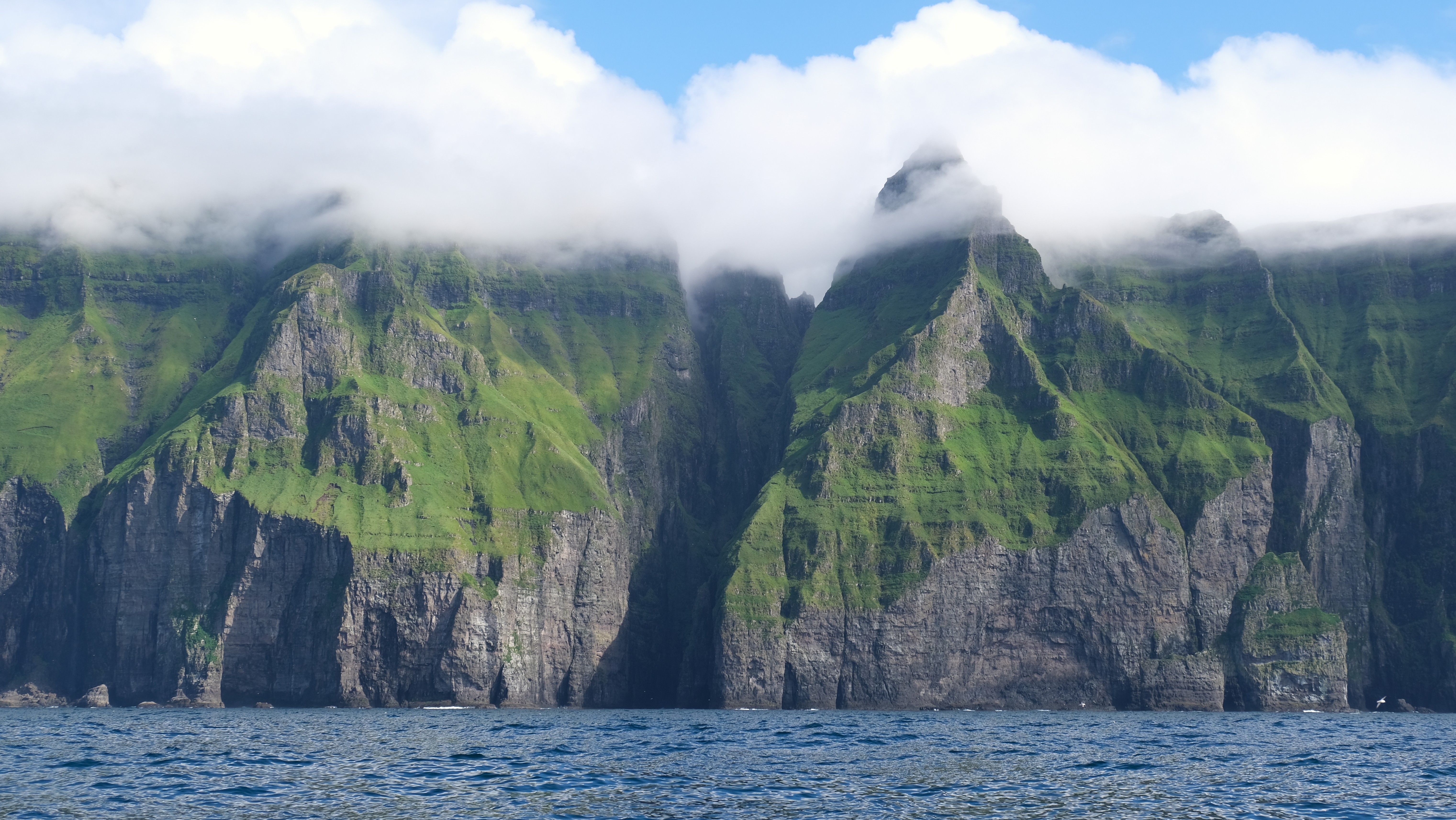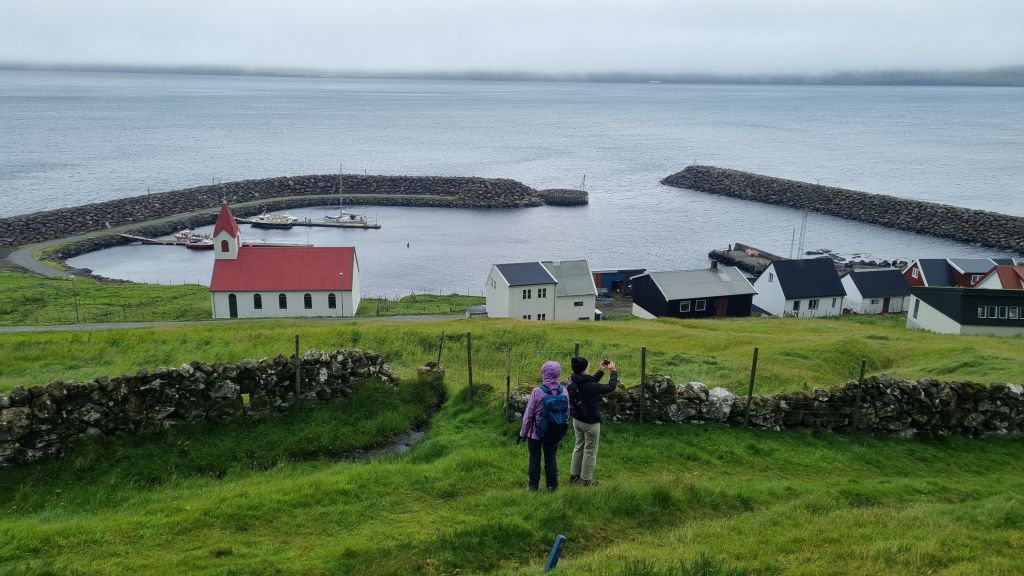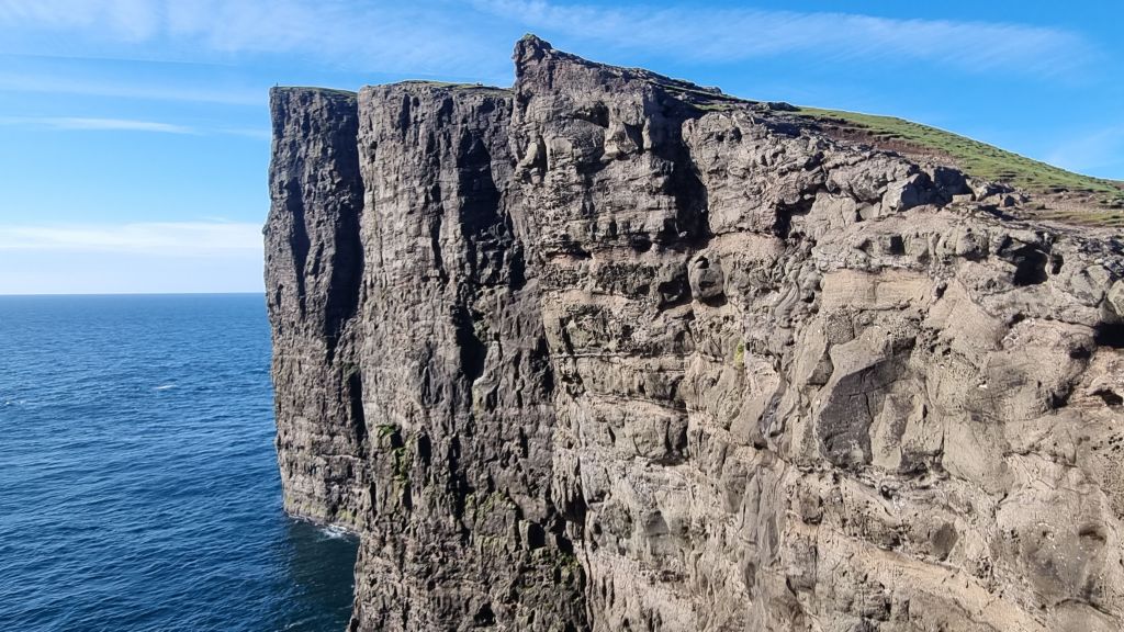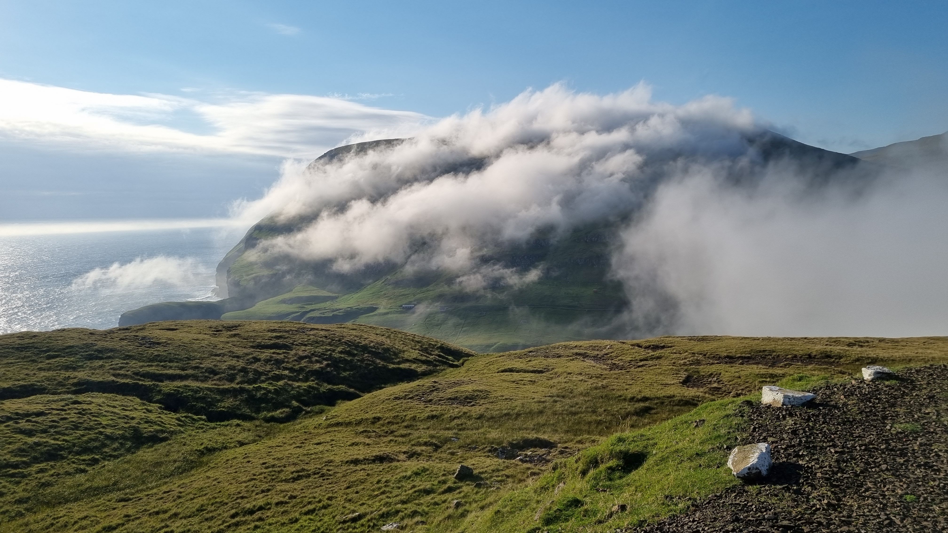 Entsprechend unserem Dreitagesrhythmus wechseln wir nach Miðvágur auf der Insel Vágar, um dort Kathrin zu empfangen, die uns für drei Wochen besucht. Der Flughafen liegt mit dem Bus nur 5 Minuten vom Hafen entfernt, wir holen sie sozusagen mit der Anke-Sophie am Flughafen ab. Am nächsten Tag legen wir dieses Mal erst um 15 Uhr ab, da sich das Hochwasser natürlich inzwischen nach hinten verschoben hat. Die Abfahrt wird so gelegt, dass die Strömung uns mit mehr als 4 Knoten ordentlich den Vágafjørður nach Südostenschiebt. Teilweise können wir schön segeln und wir kreuzen bei  düsterem Wetter in den Fjord von Miðvágur auf, die Wolken kommen fast bis auf Seehöhe herunter. Bei Nieselregen legen wir erst am Pier an und wechseln dann in den Fischereihafen, nachdem mir ein Fischer erklärt hatte, dass sein Nachbarplatz für ein paar Tage frei sein wird. Am nächsten Morgen überrascht uns die Sonne und ein wolkenloser Himmel, welch seltenes Glück! Ideal für die Wanderung zum Traelanípan. Die Wikinger sollen von dieser senkrechten Klippe ihre alten nicht mehr arbeitsfähigen Sklaven in die See gestürzt haben. Wir werden verwöhnt, auch der zweite Tag ist sonnig und führt uns in den Nachbarort Sandavágur, wo uns ein Weg entlang der Klippen zu einer 313 Meter hohen Felsnadel führt, die sich Trøllkonufingur nennt, wieder entsprechend einer Sage der Finger einer Trollfrau. Nach der Wanderung suchen wir das nette Café Fiskastykkið auf. Es ist ein historisches Warenhaus, das an einem Trockenpatz für Klippfisch steht. Annette lädt mich zu Cappuccino und Rhabarbercrumble ein. Es ist das beste Café der Färöer, es gibt leider nicht viele. Übrigens lässt das Wetter hier nur drei Nutzpflanzen auf den Inseln gedeihen: Kartoffeln, Steckrüben und Rhabarber.