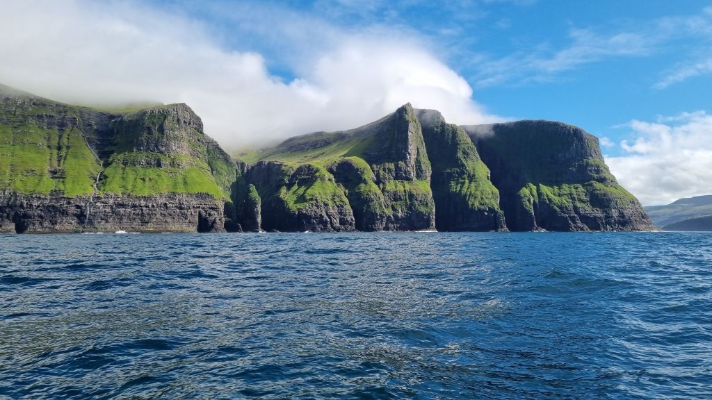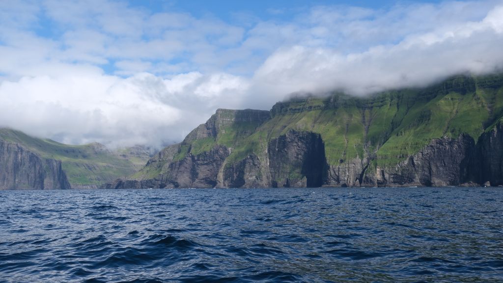 Nach drei Tagen im Industriehafen von Eiði zieht es uns weiter nach Vestmanna. Die Tide gibt uns 12 Uhr zum Ablegen vor, wir haben Glück, die Sonne scheint. Nachdem wir den Fjord nach Norden verlassen haben, segeln wir um das Nordkap von Streymoy herum. Wieder sind wir von der spektakulären Landschaft fasziniert. Bei schwachem Wind segeln wir teils mit Motorunterstützung die Westküste nach Süden. Die Welle ist zu stark für den Wind, die Genua wollen wir nicht setzen, da sie durch das Schlagen zu sehr leiden würde. Dafür schiebt uns die Strömung in die richtige Richtung. In Vestmanna sind wir erstaunt, dass der Ponton, der im Fischereihafen auf dem Satellitenbild noch zu sehen ist, in Wirklichkeit nicht mehr existiert. Wir fahren zum Ende des Fjords und trauen uns in den schmalen „small boat harbour“ und finden einen freien Platz am Kopf des nagelneuen Stegs. Ein netter Färöer ruft für mich den Hafenmeister an. Der ist damit einverstanden, dass wir hier liegen, es kostet wieder nichts, aber den Code für den Stromanschluss könne er uns nicht geben, da der Hafen nur für lokale Boote sei. Abends wird es kühl und wir helfen uns mit der Kabeltrommel selbst, indem wir uns aus dem Toilettenhäuschen Strom holen. Wir wandern am nächsten Tag entlang des Baches, der auch zum Wasserfall wird, in die Berge. Der Bach führt nur wenig Wasser, da in den Bergen drei Stauseen das Wasser sammeln und über Rohre den beiden Elektrizitätswerken im Tal zuführen. Duschen und Wäschewaschen können wir im Campingplatz. Leider funktioniert der Trockner nicht richtig und wir müssen wegen Nieselregen die gesamte Wäsche von zwei Maschinen unter Deck an Wäscheleinen trocknen. Das geht nur mit Elektro- und Dieselheizung parallel.