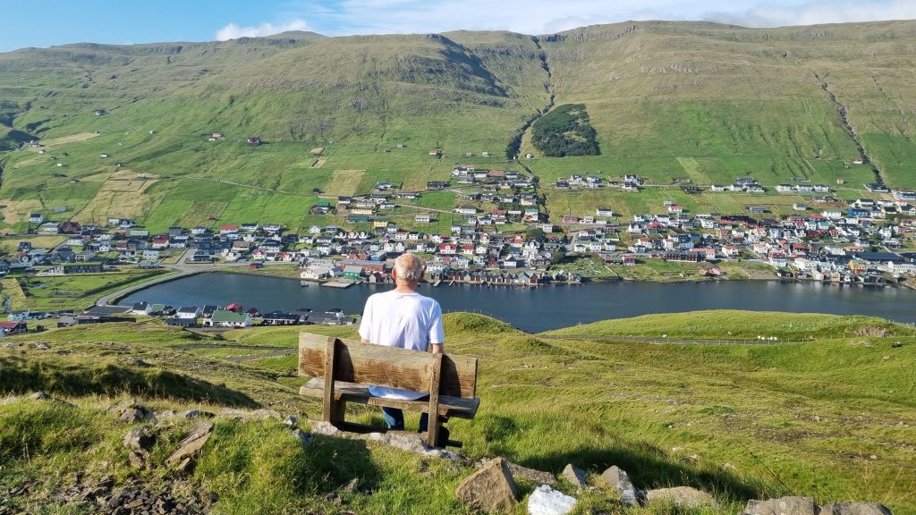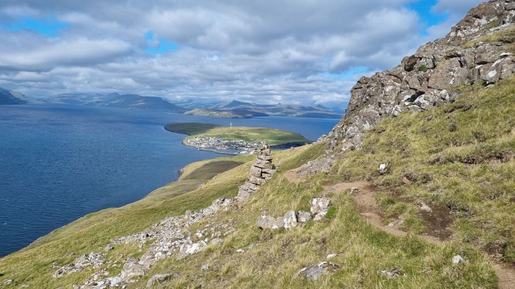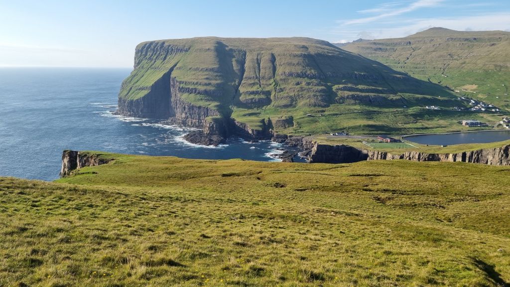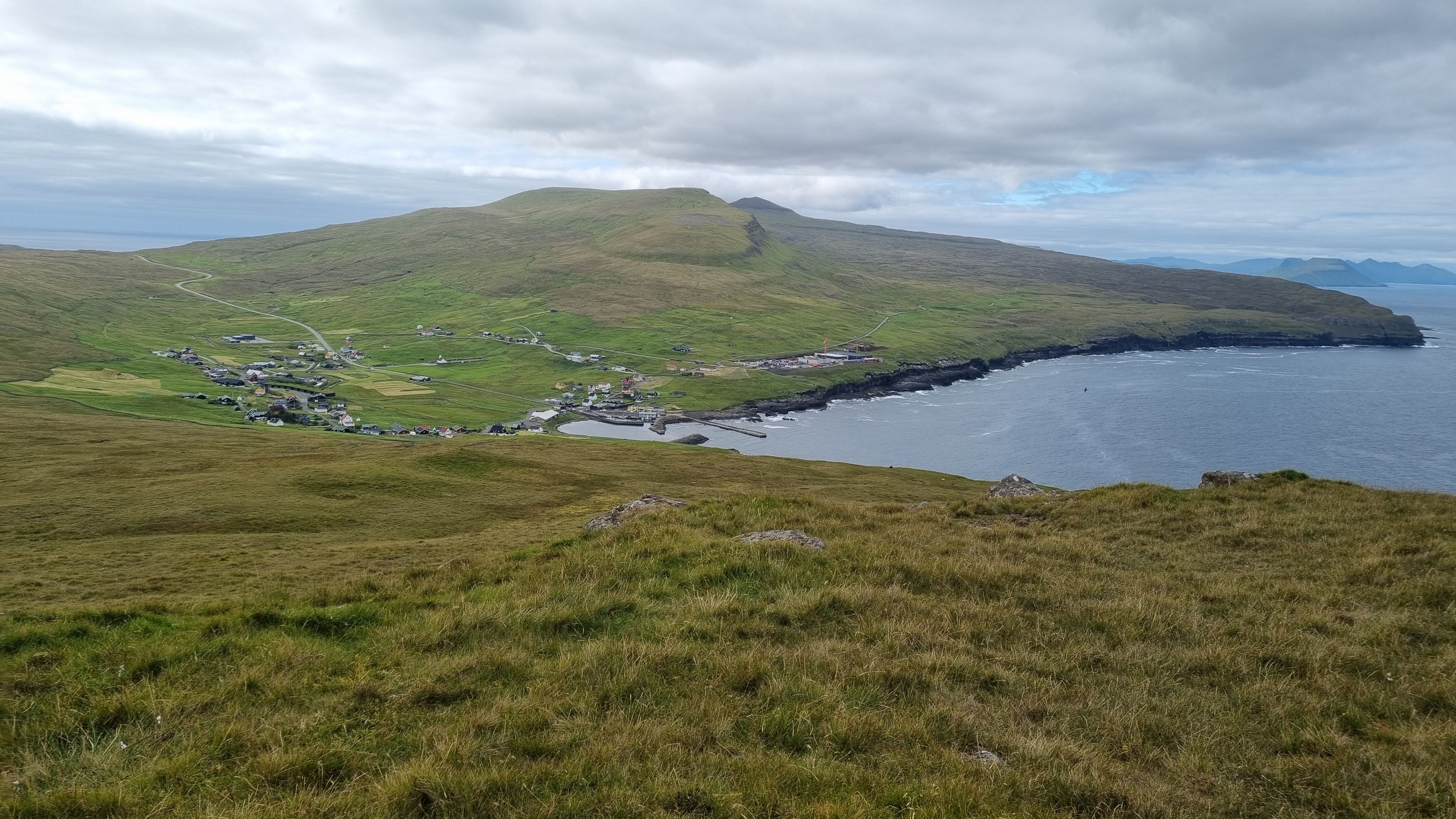 Nun ist es an der Zeit auf die südlichste Insel der Färöer zu wechseln, um von dort die Passage nach Schottland anzugehen. Ursprünglich wollten wir Tvøroyri ansteuern, aber da wir Wind aus SE haben, der stärker werden soll, und wir befürchten, dass der Schwell in den Fjord einläuft und wir keinen Platz im Hafen finden, entscheiden wir uns für Vágur, das wir in sehr guter Erinnerung von unserer Ankunft haben. Dies ist auch ein guter Punkt für den Beginn der Passage nach Süden. Es ist schön, wenn man mal einen Hafen anläuft und  schon im Voraus weiß, was uns dort erwartet. Wir haben drei Tage, in denen wir auf den Hausberg Eggjavegur wandern, von wo wir diesmal eine wunderbare Aussicht haben. Den letzten Versuch hatten wir im Nebel und Dauerregen auf halber Strecke abgebrochen. Vielleicht erinnert ihr euch an die Bilder, wo wir auf der Bank sitzen und in den Nebel starren. Nun folgen Bilder von der gleichen Stelle bei Sonnenschein und T-Shirt-Wetter… Auf dieser Klippe hatten die USA im 2. Weltkrieg eine der Loran-A-Stationen aufgebaut, um den Flugzeugen und Schiffen über dem Atlantik eine Funknavigation zu ermöglichen, denn GPS gab es damals noch nicht. Die Station wurde bis 1979 genutzt, die Gebäude werden heute von den Schafen bewohnt.