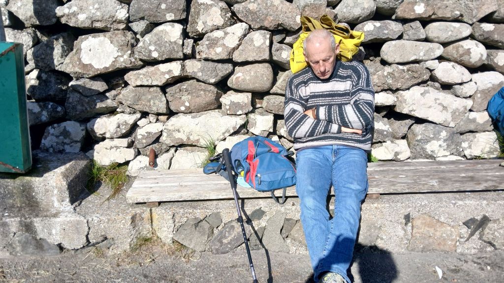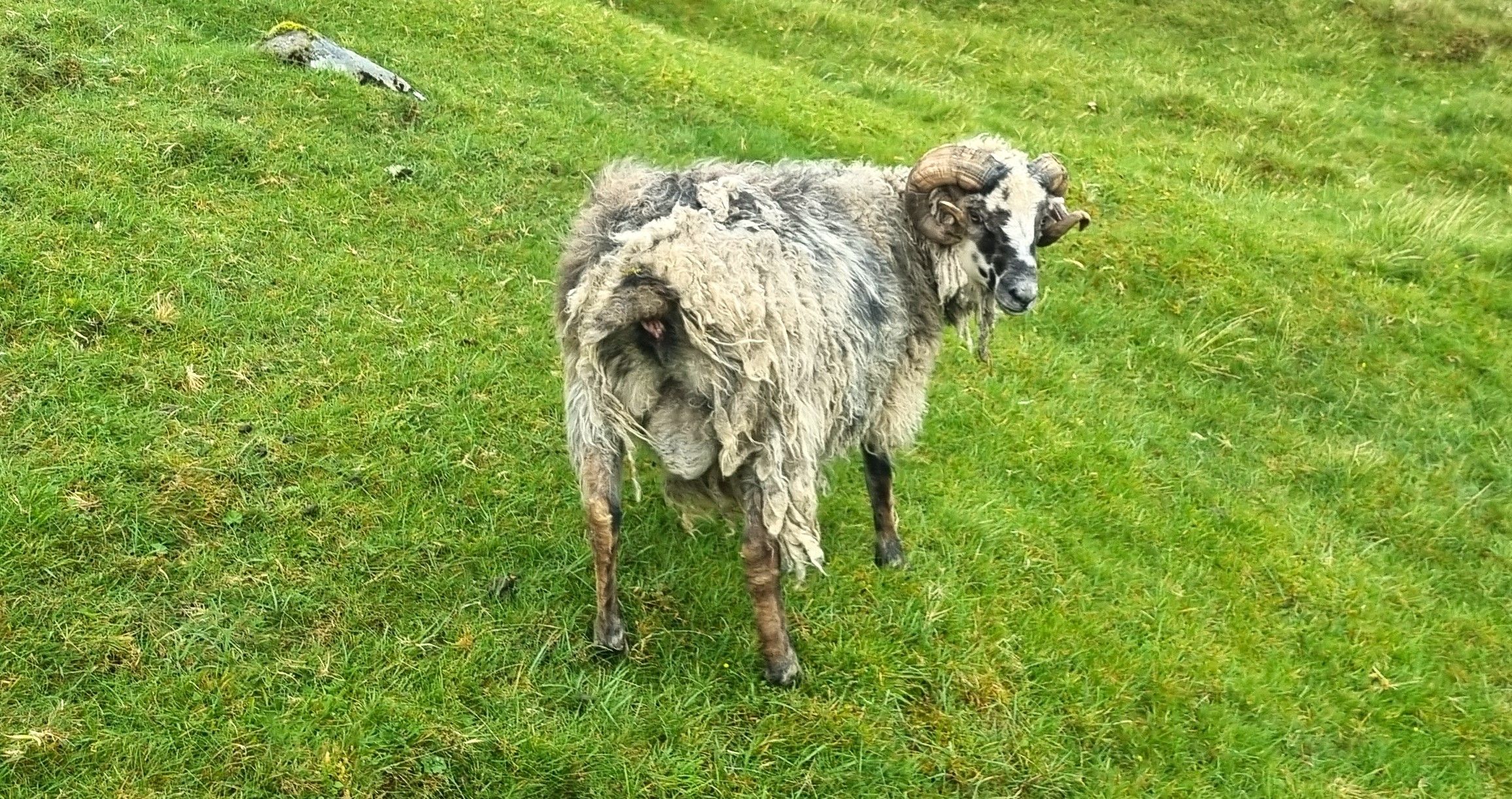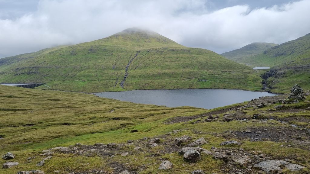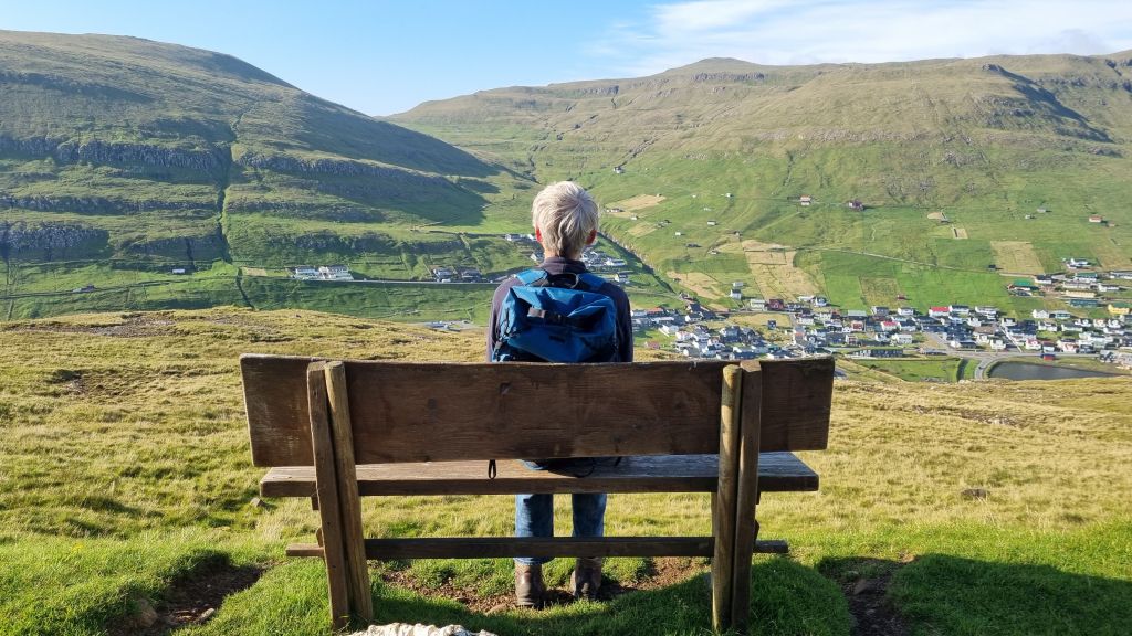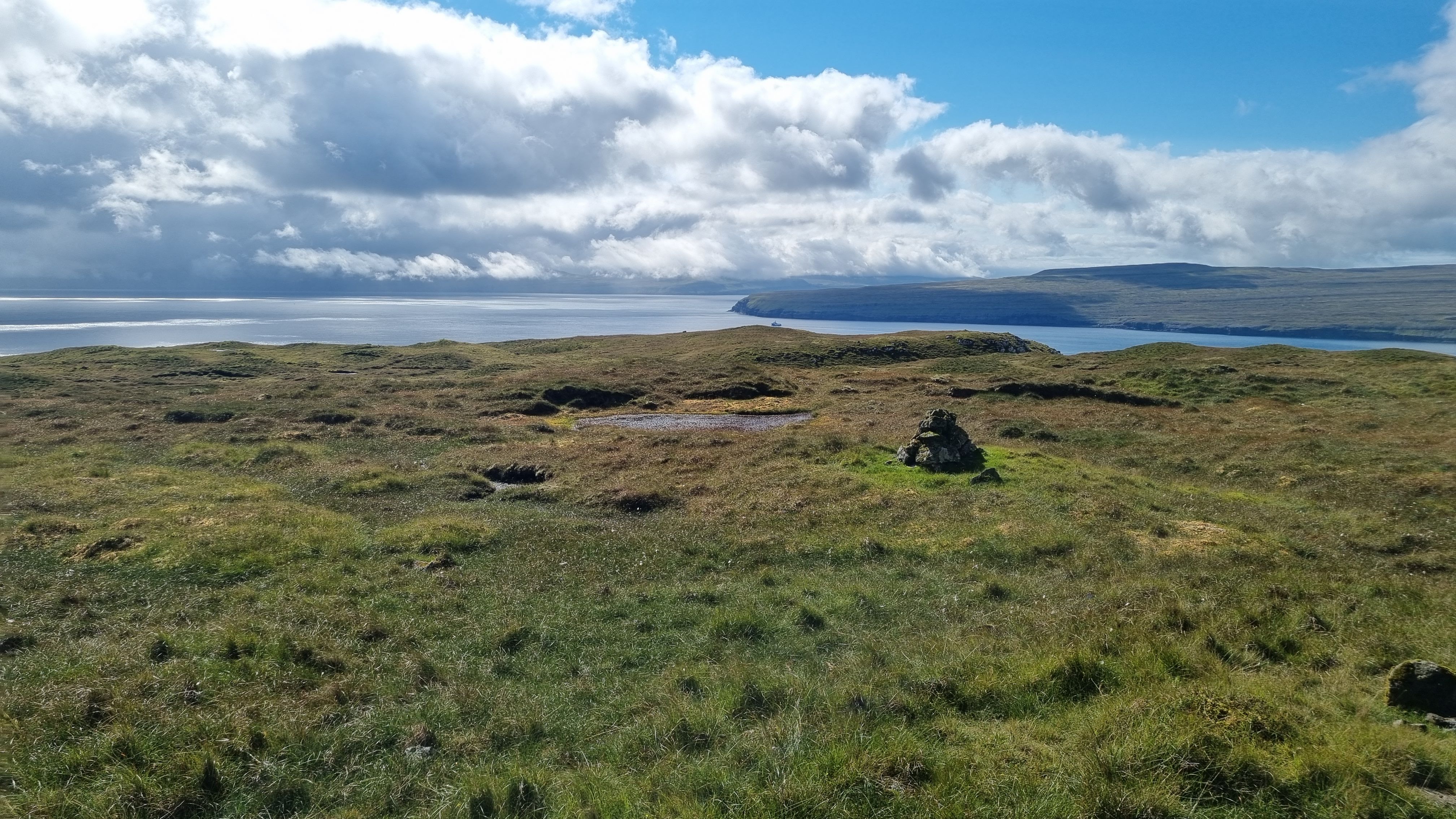 Nun ist es an der Zeit auf die südlichste Insel der Färöer zu wechseln, um von dort die Passage nach Schottland anzugehen. Ursprünglich wollten wir Tvøroyri ansteuern, aber da wir Wind aus SE haben, der stärker werden soll, und wir befürchten, dass der Schwell in den Fjord einläuft und wir keinen Platz im Hafen finden, entscheiden wir uns für Vágur, das wir in sehr guter Erinnerung von unserer Ankunft haben. Dies ist auch ein guter Punkt für den Beginn der Passage nach Süden. Es ist schön, wenn man mal einen Hafen anläuft und  schon im Voraus weiß, was uns dort erwartet. Wir haben drei Tage, in denen wir auf den Hausberg Eggjavegur wandern, von wo wir diesmal eine wunderbare Aussicht haben. Den letzten Versuch hatten wir im Nebel und Dauerregen auf halber Strecke abgebrochen. Vielleicht erinnert ihr euch an die Bilder, wo wir auf der Bank sitzen und in den Nebel starren. Nun folgen Bilder von der gleichen Stelle bei Sonnenschein und T-Shirt-Wetter… Auf dieser Klippe hatten die USA im 2. Weltkrieg eine der Loran-A-Stationen aufgebaut, um den Flugzeugen und Schiffen über dem Atlantik eine Funknavigation zu ermöglichen, denn GPS gab es damals noch nicht. Die Station wurde bis 1979 genutzt, die Gebäude werden heute von den Schafen bewohnt.