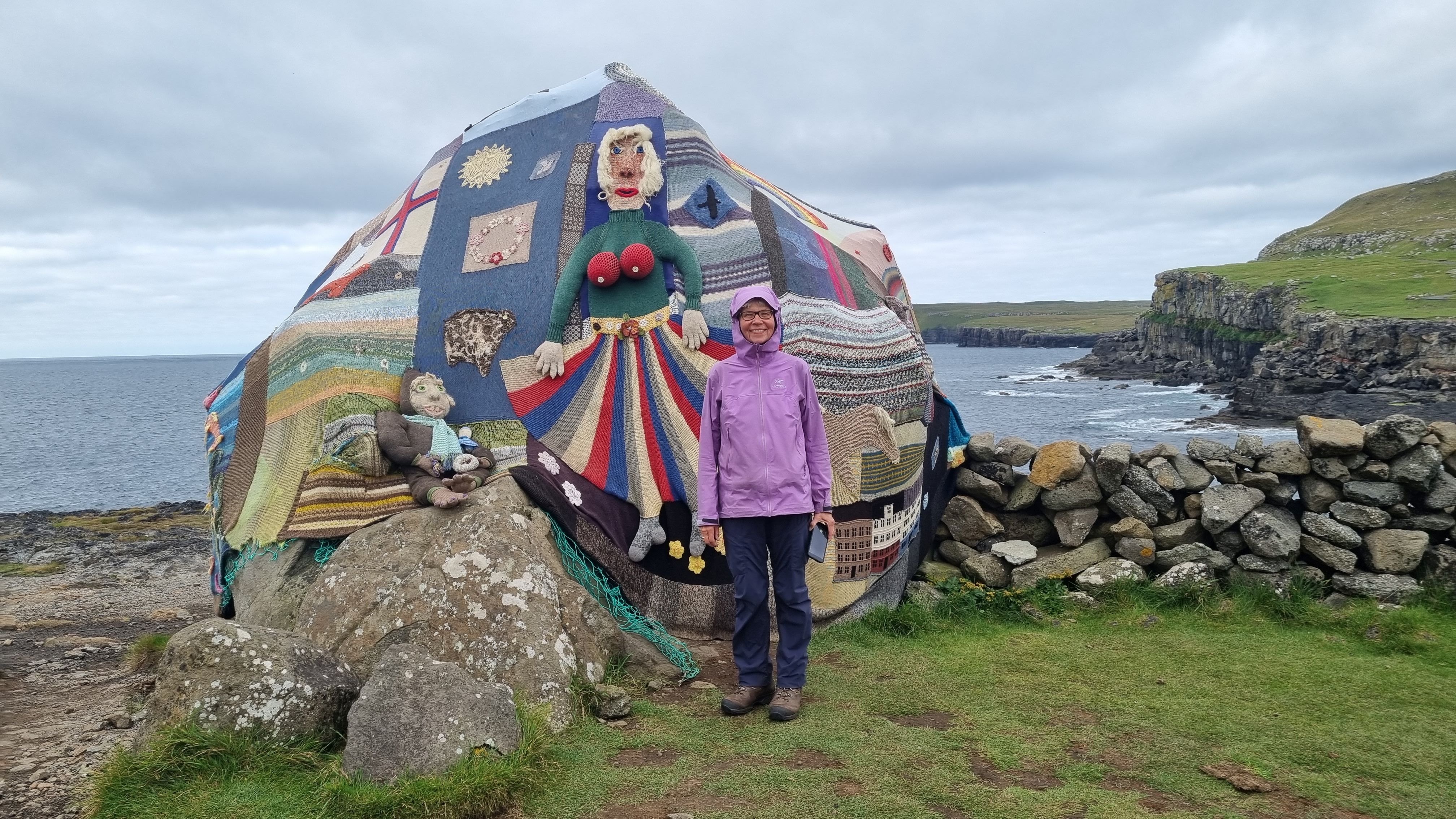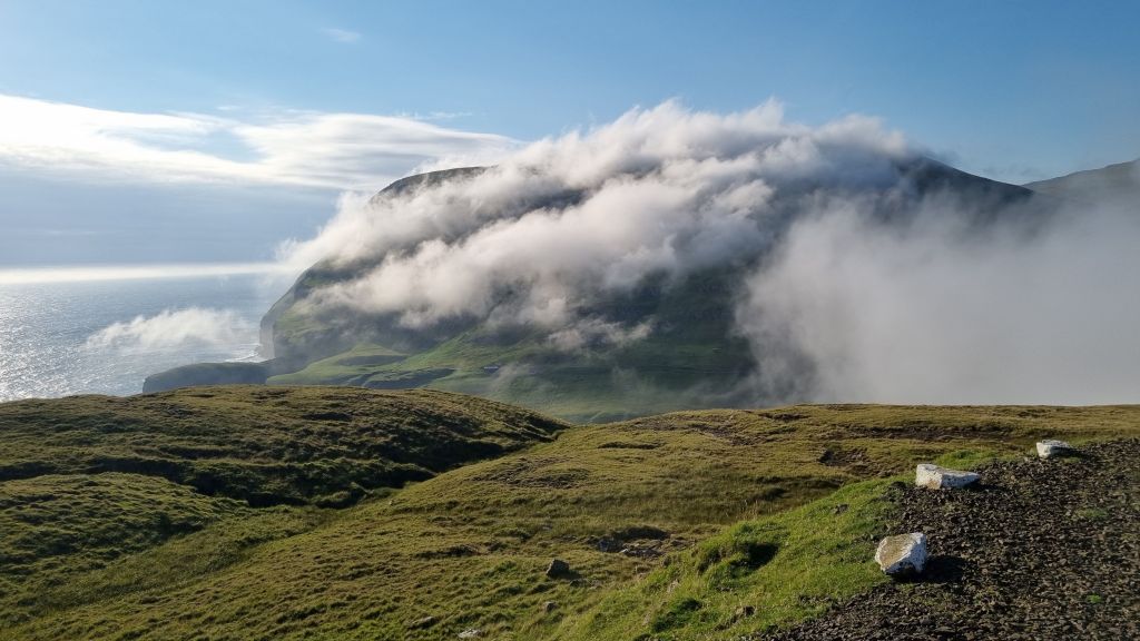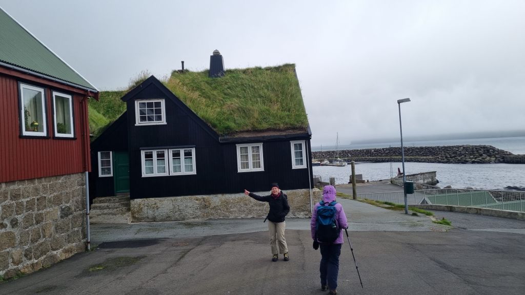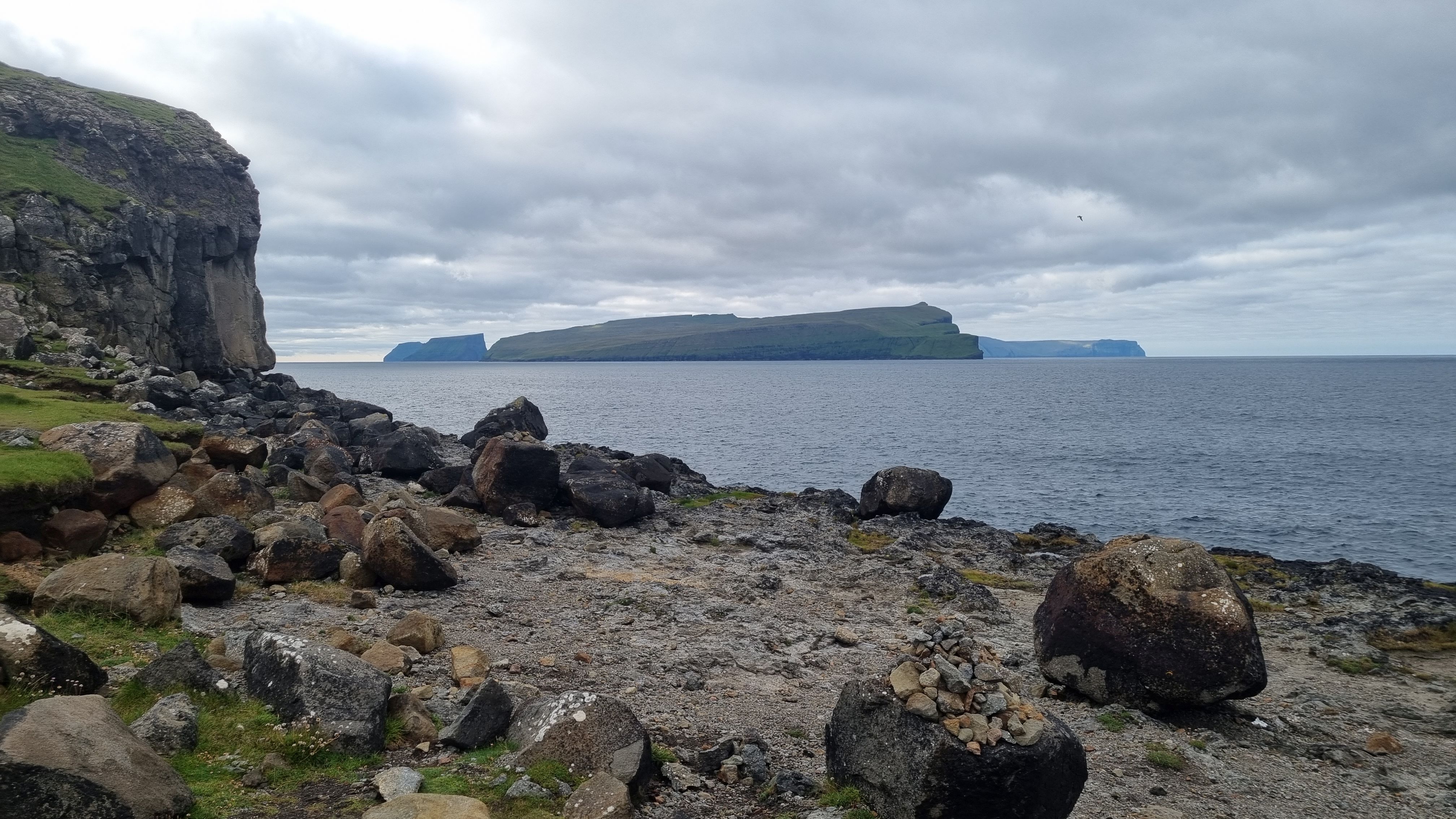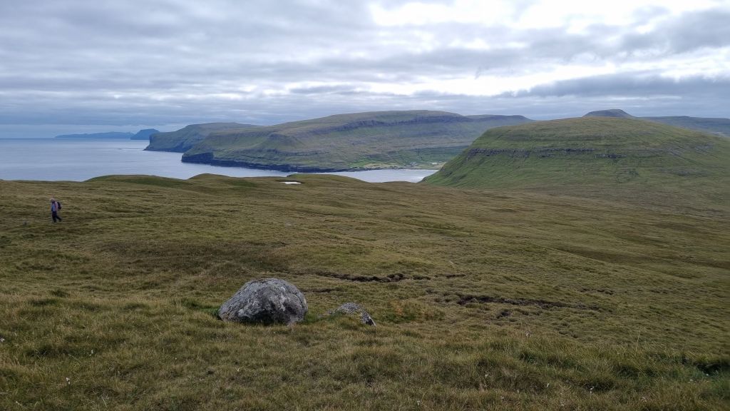 Wir wandern wieder durch eine der wunderbaren Landschaften, sanfte hüglige Moore  und scharf umrissene Klippen wechseln sich ab. Wir besuchen den Hexenfelsen Gívurin. Die Sage berichtet von einer blinden Hexe, der von einem Fremden ihr Gold geraubt wurde, das sie zu Staub zermahlt. Sie ruft eine andere Hexe, die den Fremden dann verfolgt. Der Felsen wurde durch lustige Strickereien eingewoben. Der Weg führt uns bis zu einem Strand, wo 1895 die Dreimastbark Principia strandete. Sie war auf dem Weg von Schottland zu den USA und kehrte wegen eines Brandes um und kam vor der Küste der Färöer in einen schweren Sturm. Von 28 Mann wurde nur einer gerettet, der sich an eine Ladeluke klammerte. Diese Ladeluke wird heute als Tisch in der Kirche von Kirkjubøur genutzt.