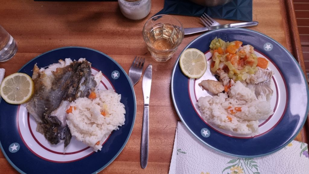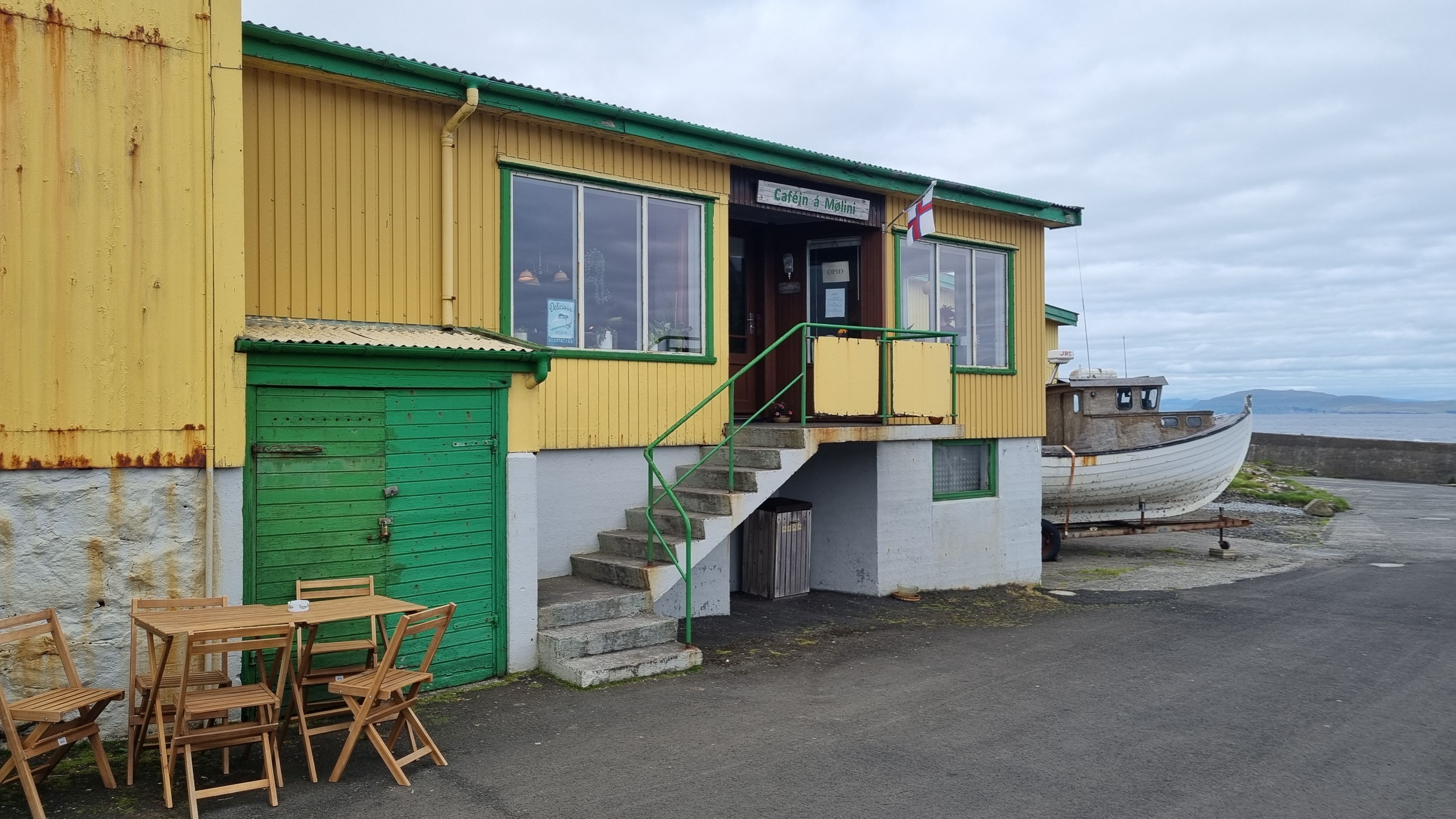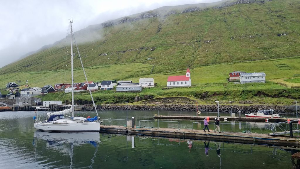 Als Nächstes erkunden wir die Insel Sandoy und finden einen Platz in dem winzigen Hafen von Skálavík. Uli von der Anuk hatte uns diesen Hafen und das tolle Café empfohlen. Wir freuen uns schon darauf, aber zuerst besteigen wir noch den Hausberg, um von dort einen Blick auf die um uns liegenden Inseln zu werfen. Als wir zurückkommen, bekommen wir von Björn, einem lokalen älteren Fischer, zwei Kabeljau geschenkt und daraus bereiten wir uns ein sehr schmackhaftes Abendessen zu. Ein anderer Färöer fragt uns später, ob wir mit ihm in die Nachbarbucht fahren wollen, da dorthin gerade Grindwale zusammengetrieben würden, um sie zu töten. Wir haben davon gelesen, wie sich bei diesem Spektakel das Meer rot färbt. Vom Verzehr der Innereien von Walen wird heute abgeraten, da sie stark mit Schwermetallen und anderen Umweltgiften belastet sind. Wir lehnen ja den Walfang ab, aber man sollte beachten, dass dieser hier eben noch üblich ist und es steht uns nicht zu, den Einheimischen Vorhaltungen zu machen, wenn nur einige gejagt werden und die Population dieser Walart groß ist und sie nicht vom Aussterben bedroht ist. Wir haben es vorgezogen, das Angebot höflich nicht anzunehmen.