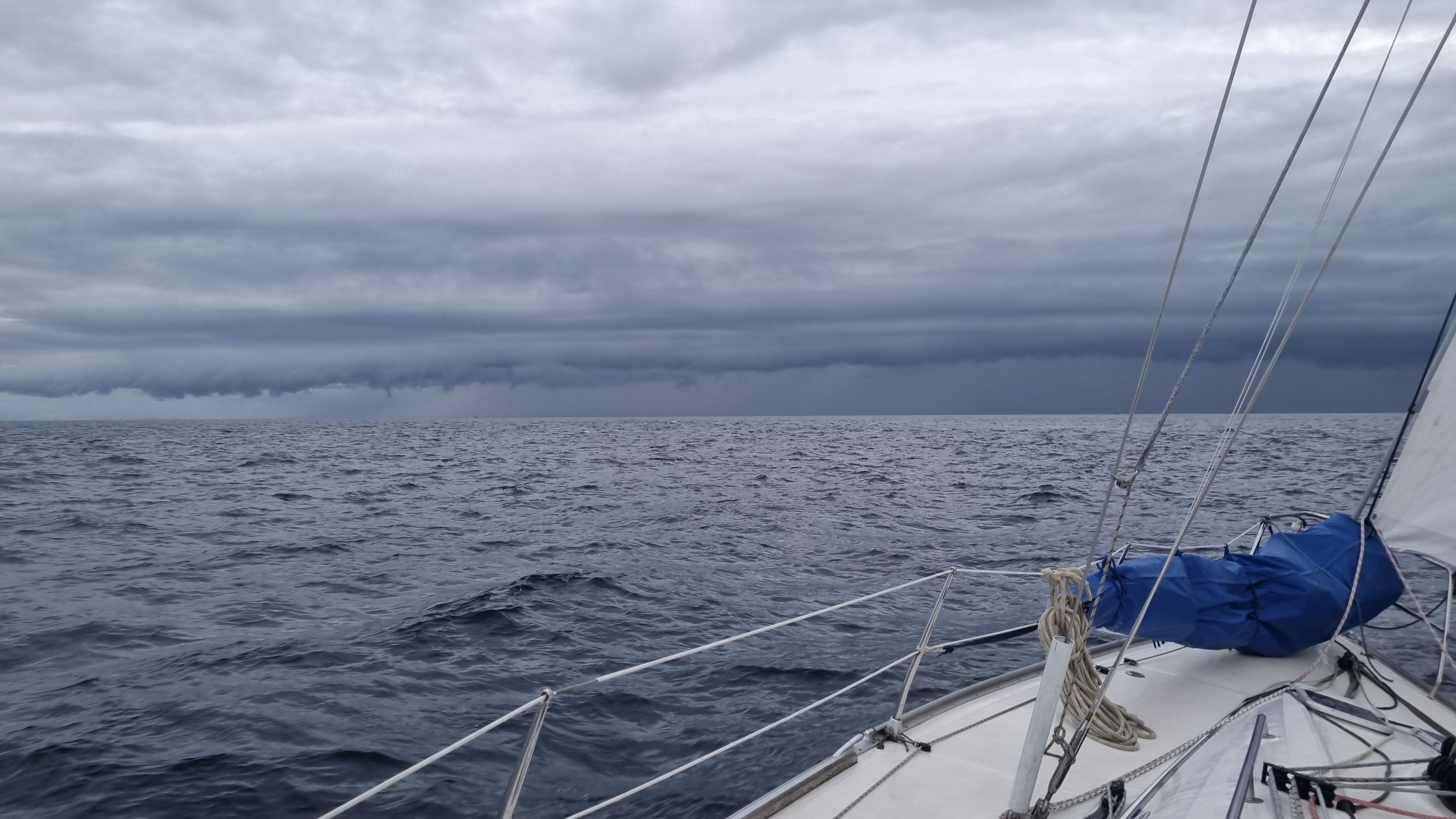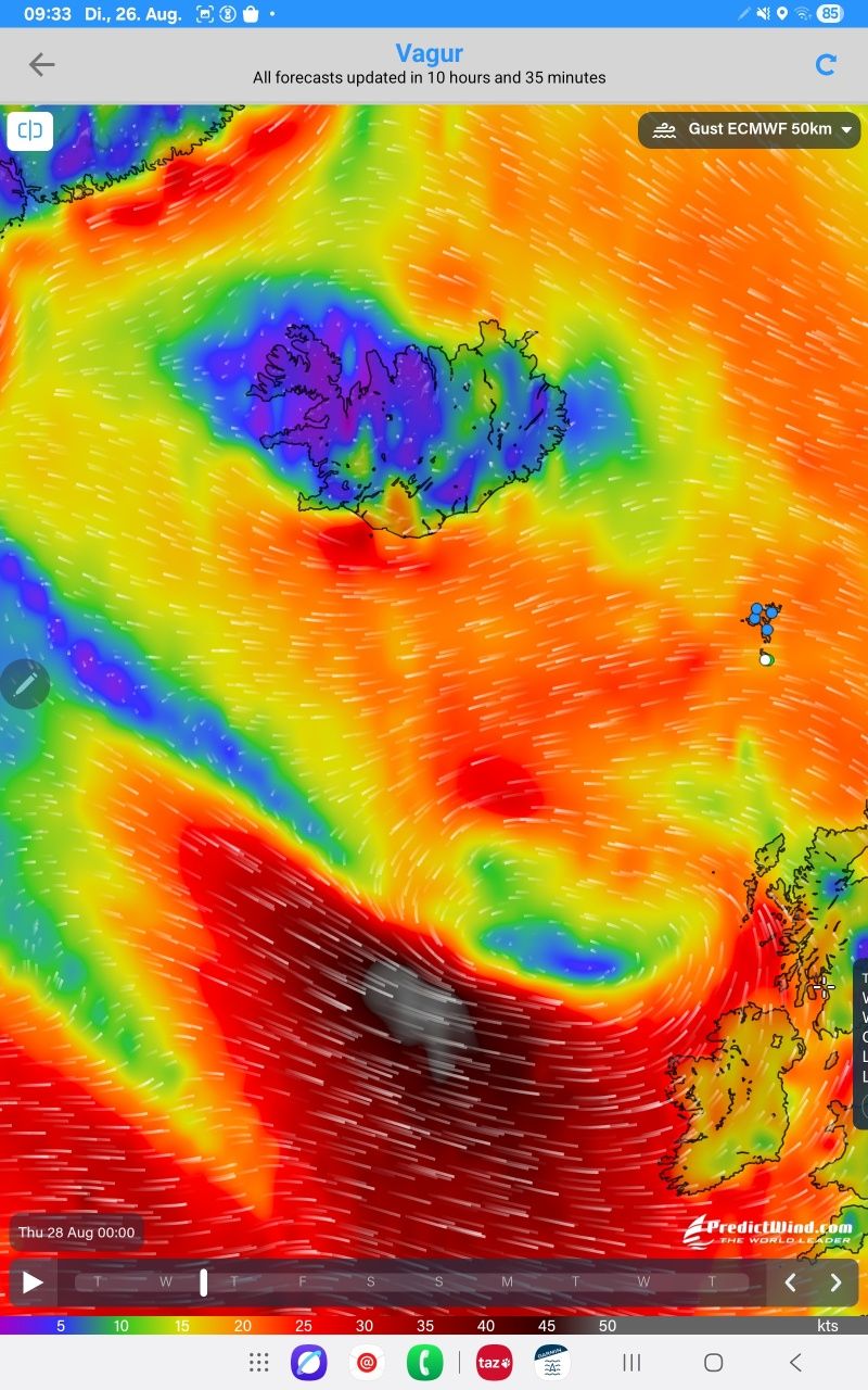 Der Ex-Hurrikan Erin beschäftigt uns einige Tage sehr, da wir uns Sorgen über seinen möglichen weiteren Weg machen. Zum Glück wählt er den Weg, den die Prognosen vorhergesagt hatten, und bleibt auf dem Atlantik, wo er eine Kurve nach Island dreht und zurückkommt. Links seht ihr die Situation am Montag, als die Entscheidung fällt, rechts die Prognose für Donnerstag Mitternacht mit Wind aus ESE.