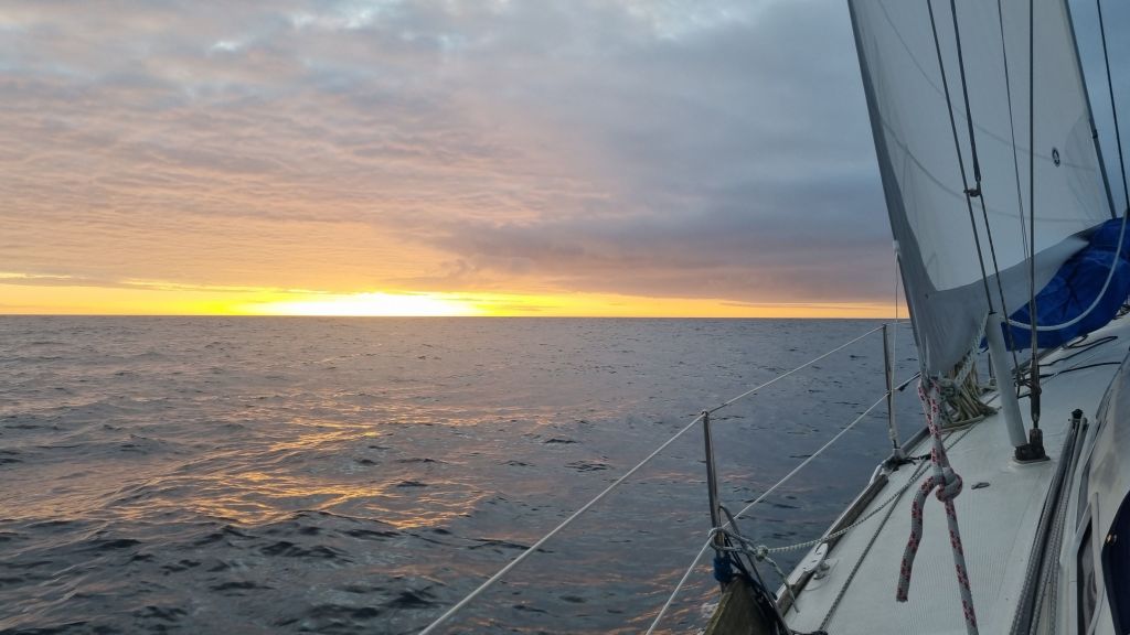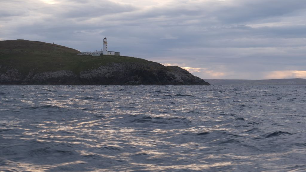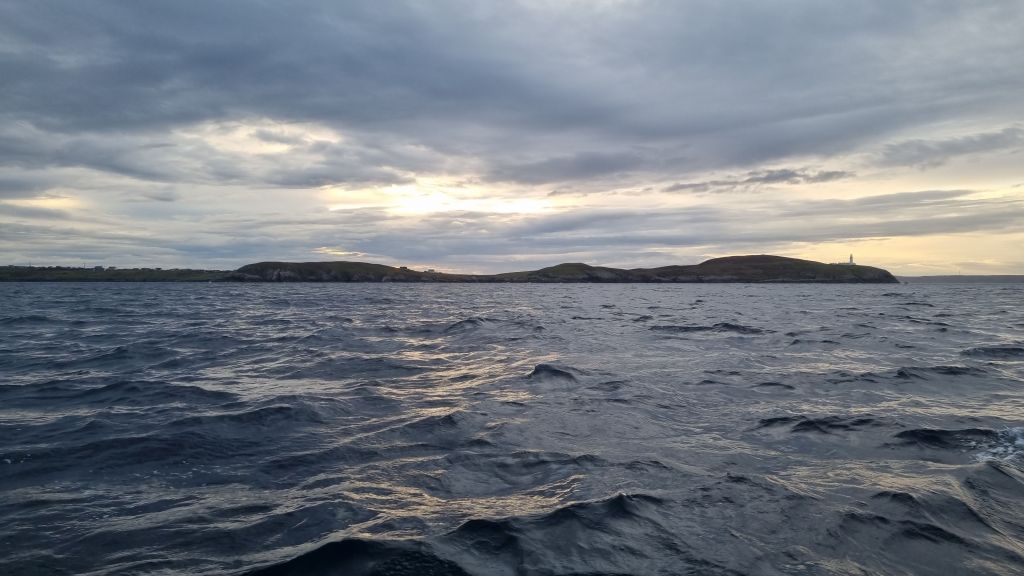 Als wir am Mittwoch morgens um kurz vor 6 Uhr ablegen, wissen wir, dass uns seine vier Meter hohe Welle aus Westen erreichen wird, wenn wir das Südkap passiert haben. Da der Wind aus östlicher Richtung kommt und die Strömung mit uns geht, entsteht eine gewaltige Kreuzsee. Leider ist der Wind zunächst noch sehr schwach, sodass wir die Maschine zur Unterstützung nutzen, um den vorgelagerten Felsen auszuweichen. Um der sich ankündigenden Seekrankheit vorzubeugen, werfen wir uns ausnahmsweise Reisetabletten ein. Der weitere Verlauf der Überfahrt wird zunächst anstrengend, da der angekündigte Ostwind leider eher ein Südostwind wird und wir für unseren Kurs 173° beinahe hoch am Wind laufen müssen, was bei dieser Welle ein ziemliches Stampfen bedeutet. Einen halben Tag später dreht der Wind auf Osten und wir haben bei schwächer werdender Dünung des Sturmtiefs ein angenehmes Segeln und können einen schönen Tag zwischen Sonnenauf- und -untergang genießen. Kurz vor unserem Ziel Stornoway segeln wir in eine schwarze Wand aus Schauern und bergen aus Vorsicht die Segel, um mit Maschine das letzte Kap zu nehmen und sind sehr froh, am Donnerstag um 22:15 Uhr anzulegen. Der Hafenmeister empfängt uns am Steg und erinnert sich an den Namen Anke-Sophie. Auch ich erkenne ihn wieder. Annette und ich waren  Ostern 2022 hierher gesegelt und ich war mit Thomas K. einige Wochen später wiedergekommen, um von hier über die Orkney-Inseln nach Norwegen zu segeln.