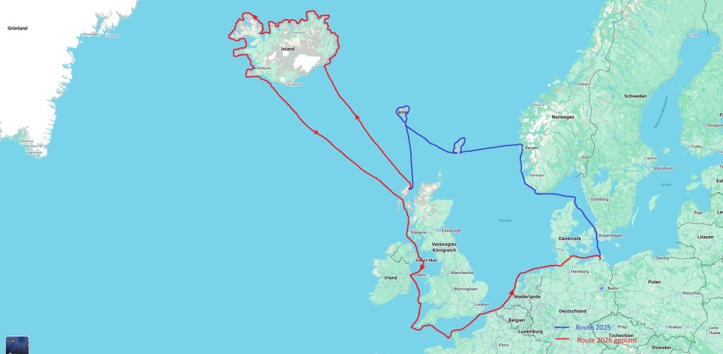 2026 wollen wir den Törn fortführen und ab Anfang Mai zur Ostküste Islands segeln. Wir werden uns viel Zeit nehmen, um Island gegen den Uhrzeigersinn zu umrunden. Der Plan ist, der Nordküste von Ost nach West von Bucht zu Bucht zu folgen, viel Zeit in den Nordwest-Fjorden zu verbringen und dann über Reykjavík zu den Vestmannaeyjar (Westmännerinseln) zu segeln. Von dort planen wir zurück nach Schottland und weiter nach Süden durch die Irische See und den Ärmelkanal nach Cuxhaven zu fahren. Anke-Sophie soll den nächsten Winter wieder in Stralsund verbringen.