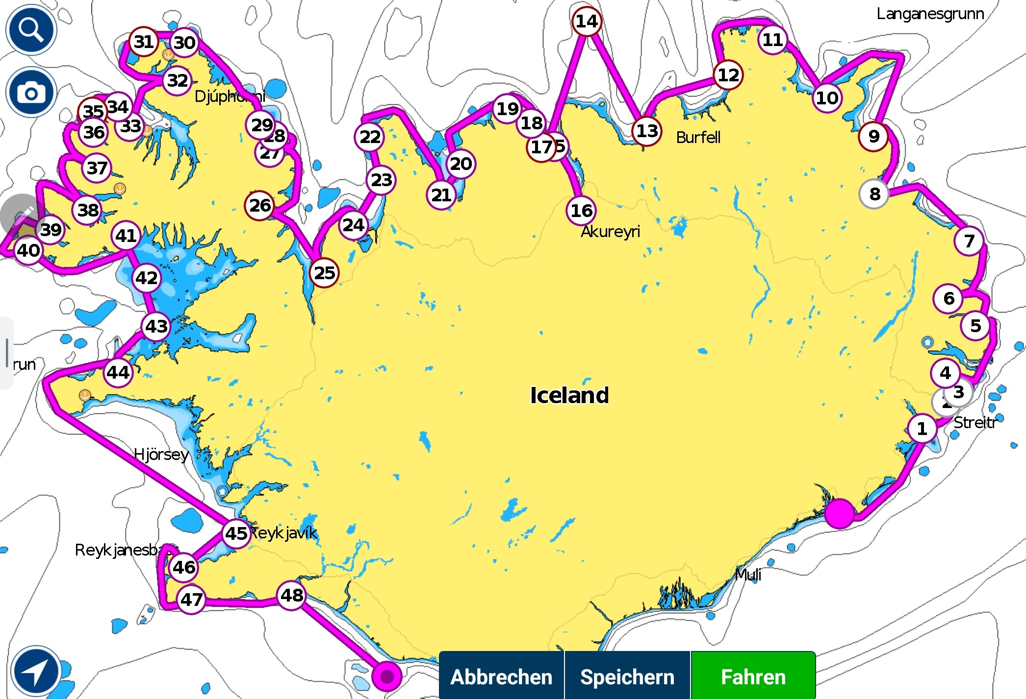 Route um Island mit Etappenzielen (siehe auch die Termine-Tabelle unten)